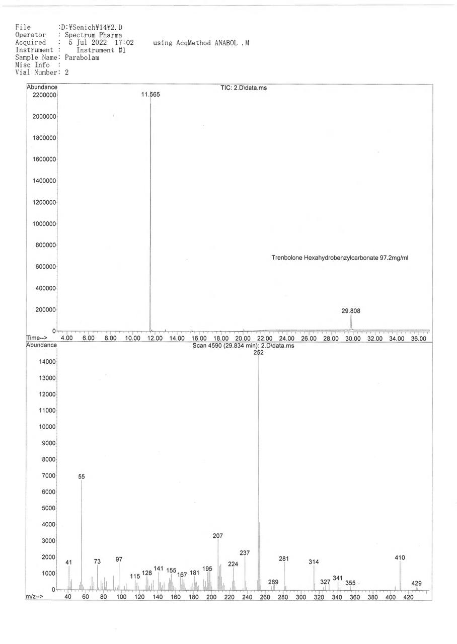 “Spectrum Pharma” PARABOLAN Batch No: 1701201717T Образец представляет собой виалу объёмом 10мл. В которой ДВ Гексагидробензилкарбонат заявлено 100мг/мл. 1) Хроматография: образец содержит Гексагидробензилкарбонат. 2) Масс-спектрометрия: содержание ДВ в образце ~97.2мг/мл. 3) Посторонние примеси: НЕ ОБНАРУЖЕНЫ