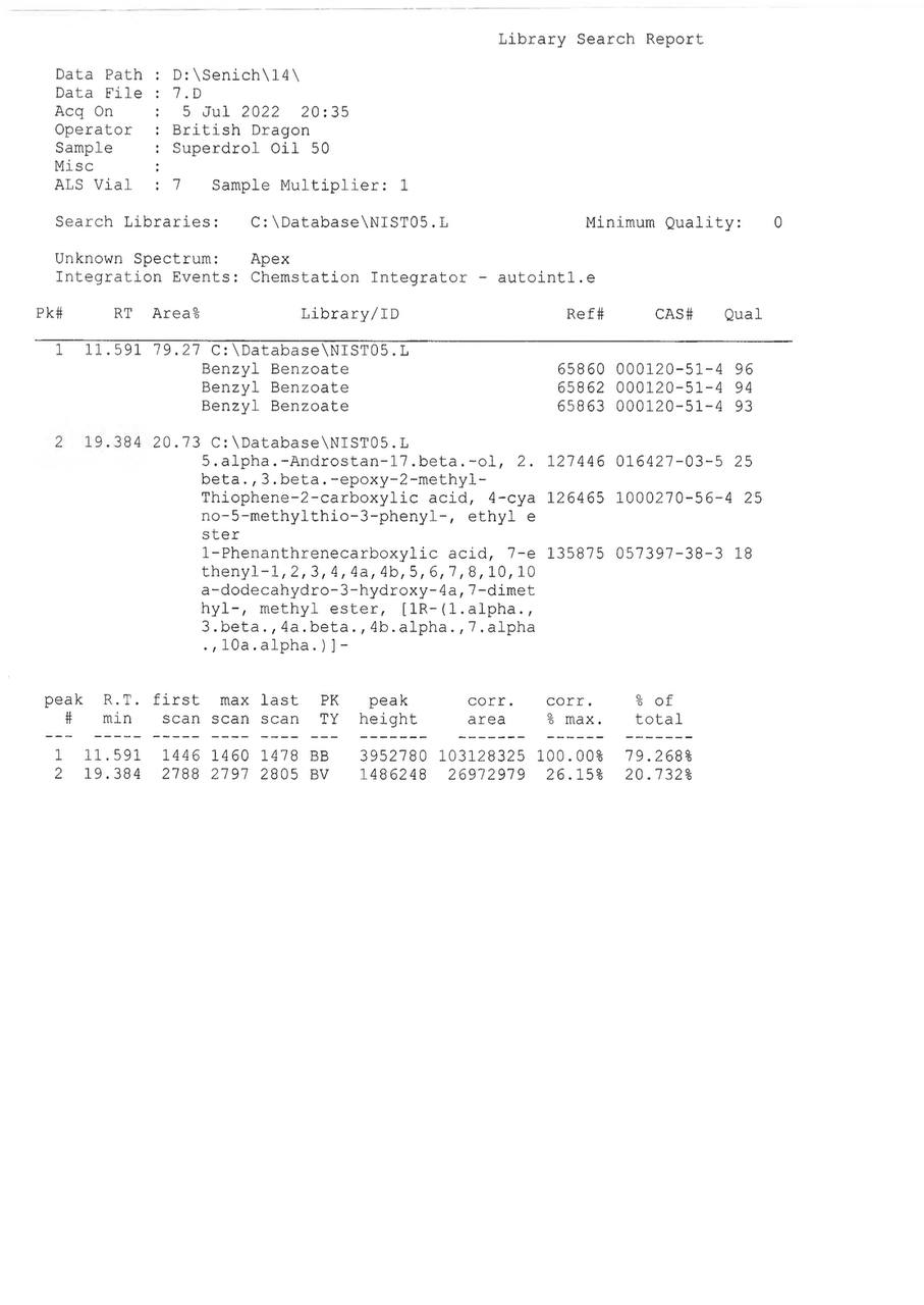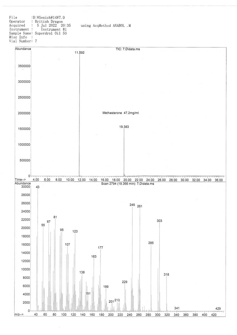 “British Dragon” SUPERDROL OIL 50 Образец представляет собой виалу объёмом 10мл. В которой ДВ Метилдростанолон заявлено 50мг/мл. 1) Хроматография: образец содержит Метилдростанолон. 2) Масс-спектрометрия: содержание ДВ в образце ~47.2мг/мл. 3) Посторонние примеси: НЕ ОБНАРУЖЕНЫ