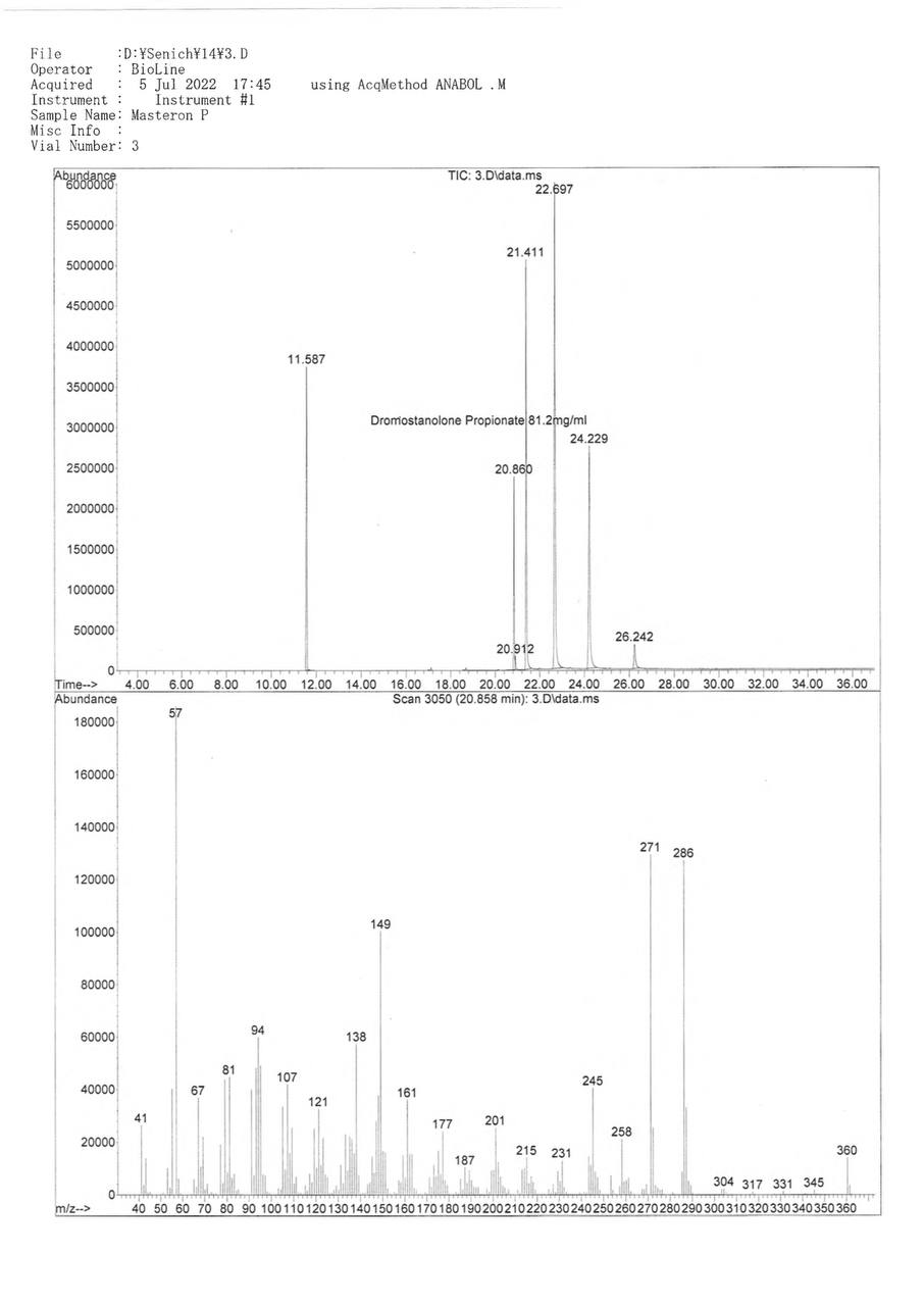 “BioLine” MASTERON P Образец представляет собой виалу объёмом 10мл. В которой ДВ Дростанолон Пропионат заявлено 100мг/мл. 1) Хроматография: образец содержит Дростанолон Пропионат. 2) Масс-спектрометрия: содержание ДВ в образце ~81.2мг/мл. 3) Посторонние примеси: НАЙДЕНО ГИДРОКСИПУРИНОВОЕ СОЕДИНЕНИЕ 1,4-ДИОКСАСПИРО(4.4)НОНАН. НАЙДЕНО ХИМИЧЕСКОЕ СОЕДИНЕНИЕ 5-ОКСАЗОЛИДИНОН.