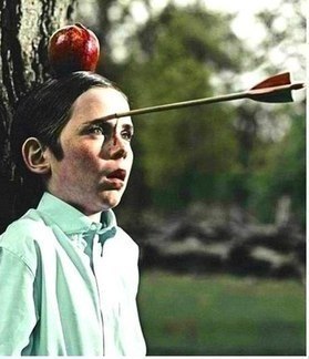 Многие видели эту картинку, но далеко не каждый знает ее историю. В 1985 году 13-летний Тайлер Керк (герой фотографии) прошел кастинг на съемку в рекламе шоколадной пасты Nutella. Это был довольно типичный ролик,где по сюжету мальчик сидит во дворе своего дома и печально грызёт яблоко.Далее по сценарию из магазина возвращаются родители,демонстрируя ребёнку банку "Nutella",а тот радостно бежит намазывать бутерброды. На съёмочной площадке стояла огромная корзина с красными яблоками,-запас для неудачных дублей.Получилось так,что действие с яблоком сняли со второй попытки,и вся корзина оказалась в распоряжении съёмочной группы. Рекламщики-народ творческий,и просто съесть гору яблок им показалось скучным.Где-то в соседней студии они нашли спортивный лук и начали расстреливать яблоки.Среди фотографов был некий Джейсон Аддерли,который в колледже профессионально занимался стрельбой из лука.У него родилась идея фото-сюжета,состоящая из двух частей.Лицо человека с яблоком на голове и то же лицо с простреленным яблоком.Суть фотографии-показать разницу эмоций:накал до выстрела и эйфория после. Непоседливый Тайлер,который слышал весь этот разговор,напросился на роль "мишени"-все знали о живой мимике мальчика и фотограф согласился. Тайлера поставили к декорационному дереву,настроили камеру,сделали первый снимок.Джейсон взял в руки яблоко,но тут в голову ему пришла идея-сделать третью картинку,общий план,изображающий его самого,метящего в мальчика.Это никому не могло показаться опасным.Джейсон отошёл на 5 метров,натянул тетиву(специально метя на несколько метров левее),щелкнул затвор камеры.Человек,сделавший снимок,закричал "Подожди,яблоко еще не пробили!".Автоматически опуская лук,стрела соскочила,и попала мальчику прямо в лоб.Фотограф спустил затвор как раз в этот момент,через секунду Тайлер Керк упал замертво. Джейсон Аддерли был приговорён к 35-ти годам заключения.
