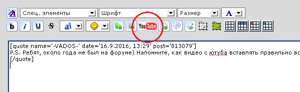 P.S. Ребят, около года не был на форуме) Напомните, как видео с ютуба вставлять правильно вставлять, а то у меня тупо ссылка вставляется, без предпросмотра.(звиняйте, что не по теме) нажимаешь на кнопку ютуба и вставляешь туда ссылку, например https://www.youtube.com/watch?v=gFbgltwA0iI ![]() |