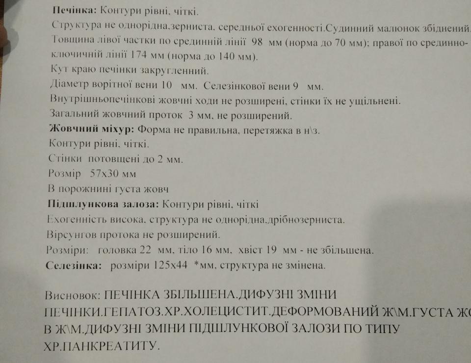 Онлайн доктор бесплатный для беженцев сказал сделать УЗИ печени, почек и "черевной порожнини" если это все не доступно то пить холудексан 6 месяцев. УЗИ печени сделаю обязательно но не сейчас. |