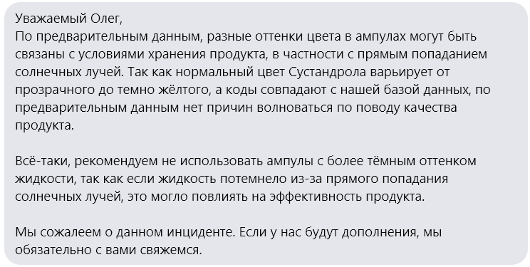 Директор відповів:Да, знаю, был у нас маленьктй косячок, смешали ампулы двух разных партий, разливов. Если коды бьются то это наш продукт и повода для волнения нет»