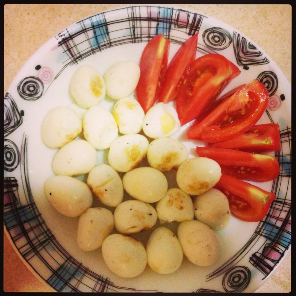 По рецепту от Скоромного. Яйца перепилиные сваренные, а потом обжаренные) ничего особенного, но как замена обычным вареным яйцам - гуд) залетает только так)