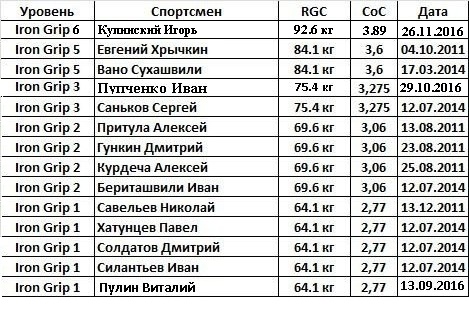1. Возглавляю рейтинг Железного хвата, закрыв 6-й уровень. https://vk.com/topic-4840890_30162433 Видео. [video]https://www.youtube.com/watch?v=lUapHnQXPsQ[/video] 2. Первый в мире Супер Бастард. http://www.fatbastardbarbellco.com/FBBCGRIPPERCERTS.html 3. Возглавляю таблицу по Крашеру 2.5 http://www.fatbastardbarbellco.com/CRUSHERS.html 4. Возглавляю таблицу по Бомбе 8-фунтовой. http://www.fatbastardbarbellco.com/BOMBCERT.html 5. Девид Хорн определил по итогам года лучших атлетов, и в свой список атлетов десятилетия. http://www.gripboard.com/index.php?/topic/...rants-for-2016/ It was another great year of performances! Here are the Grip Hall of Fame entrants for 2016. Congratulations to all! All 2010s Bloom, Jerome (England) – 66k Goodman, Gil (USA) Hall, Eddie (England) Horwood, Phil (England) Joronen, Arto (Finland) Junnilainen, Niko (Finland) Kupinsky, Igor (Ukraine) Larsen, Thomas (Norway) Raftopoulos, Evan (USA) – 66k Rytkönen, Anu (Finland) – (Female) Stepien, John (USA) Blair, Rob (England) – promoted from 83k to open http://www.davidhorne-gripmaster.com/griphalloffame.html