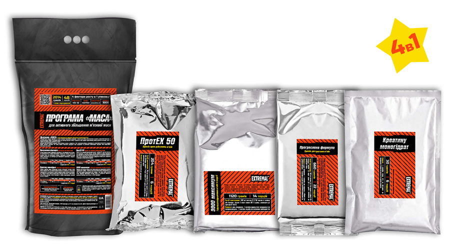 ![]() Программа спортивного питания МАССА Готовое решение для быстрого увеличения мышечной массы тела. Внутри основного пакета находятся 4 пака с различными спортивными добавками: 1) Протеин для роста мышц (принимается утром), 2) Антикатаболическая сыворотка (за пол часа до тренировки), 3) Анаболический энергетик креатин, (перед тренингом) и 4) Высококалорийный гейнер - для восстановления энергии и мышц после тренинга. 4 в 1! Все рассчитано по порциям на строго определенное количество дней. ![]() 1 кг упаковка рассчитана на 4-х разовый прием в течении 7 дней, стоимость 290 грн, ![]() 2 кг упаковка рассчитана на 4-х разовый прием в течении 14 дней, стоимость 500 грн ![]() К упаковке прилагается мерная ложка, резиночки для закрывания пакетов, стикер с личным кодом упаковки (для получения скидки), а также ПЛАН ПИТАНИЯ. План выглядит как меню, состоит из еды и спортивных добавок, рассчитан на спортсмена весом 70 кг со средним уровнем физической активности. Вы также можете самостоятельно редактировать план питания с помощью компьютерной программы МОЙ бодибилдинг. ![]() Программа МАССА это очень эффективный продукт для активного набора массы. Купив всего 1 упаковку Вы получите сразу 4 разных продукта спортивного питания, что существенно улучшит ваш результат и позволит сэкономить финансы. Разработано tm EXTREMAL -------------------- Google: спортивне харчування extremal