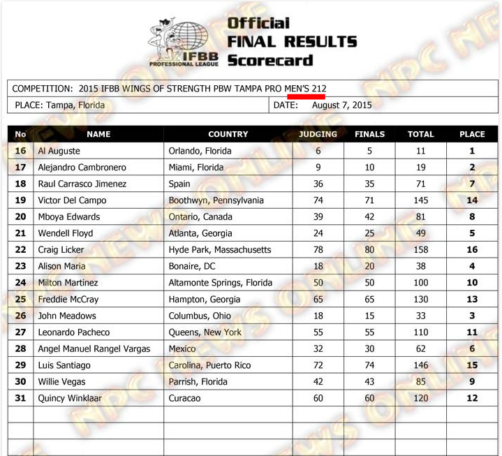 ✔ Результаты турнира 2015 Tampa Pro в весовой категории "до 212 фунтов":