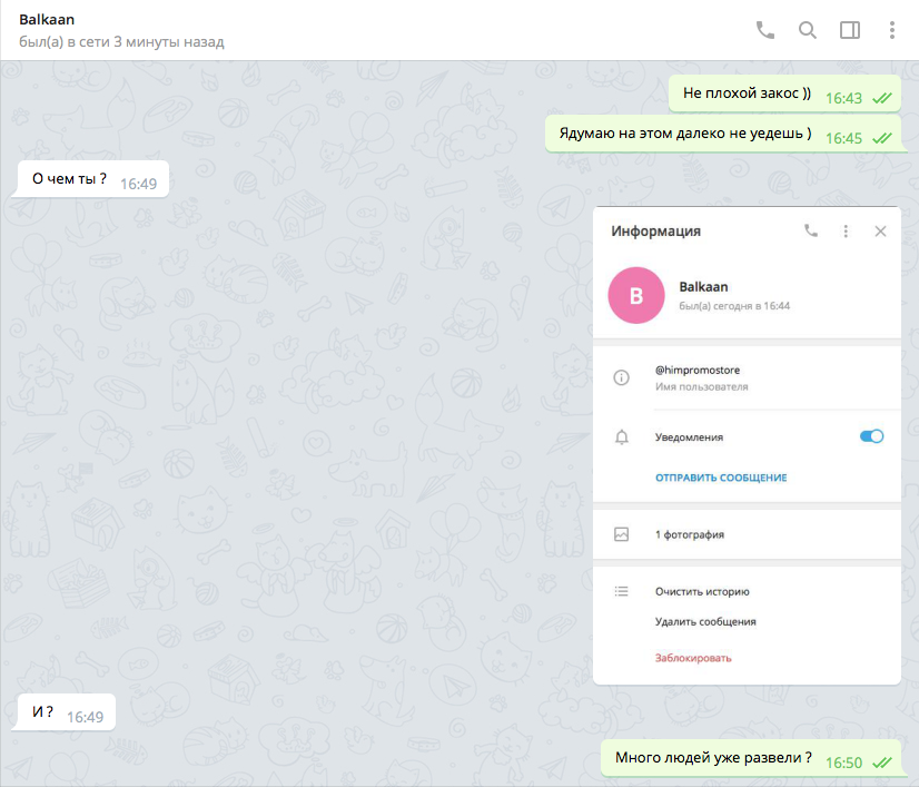 HimPromo Опубликовано 17 сентября, 2018 Автор Опубликовано 17 сентября, 2018 Приветствую друзья!) Информативный пост... Ещё августе мне в телеграмм писал человек (подписан он был по другому) вот с таким вопросом Я улыбнулся, и забыл про это, подумав варится очередной левак ) Сегодня же листаю чаты и в глаза бросился некий Balkan, не помню такого Открываю карточку этого контакта и наблюдаю интересные вещи Далее пишу ему, на что он спокойно реагирует ) Ну и дальше естественно мороз ) Я то особо не переживаю, так как никогда не отклоняюсь от поставленного алгоритма работы, в котором первым пунктом сказано что заказы принимаются только через магазин, но донести до общественности считаю нужным, ибо кто-то пытается продать "левак" либо просто обмануть и получить денежные средства прикрываясь моим ником ! Будьте бдительны, друзья!)