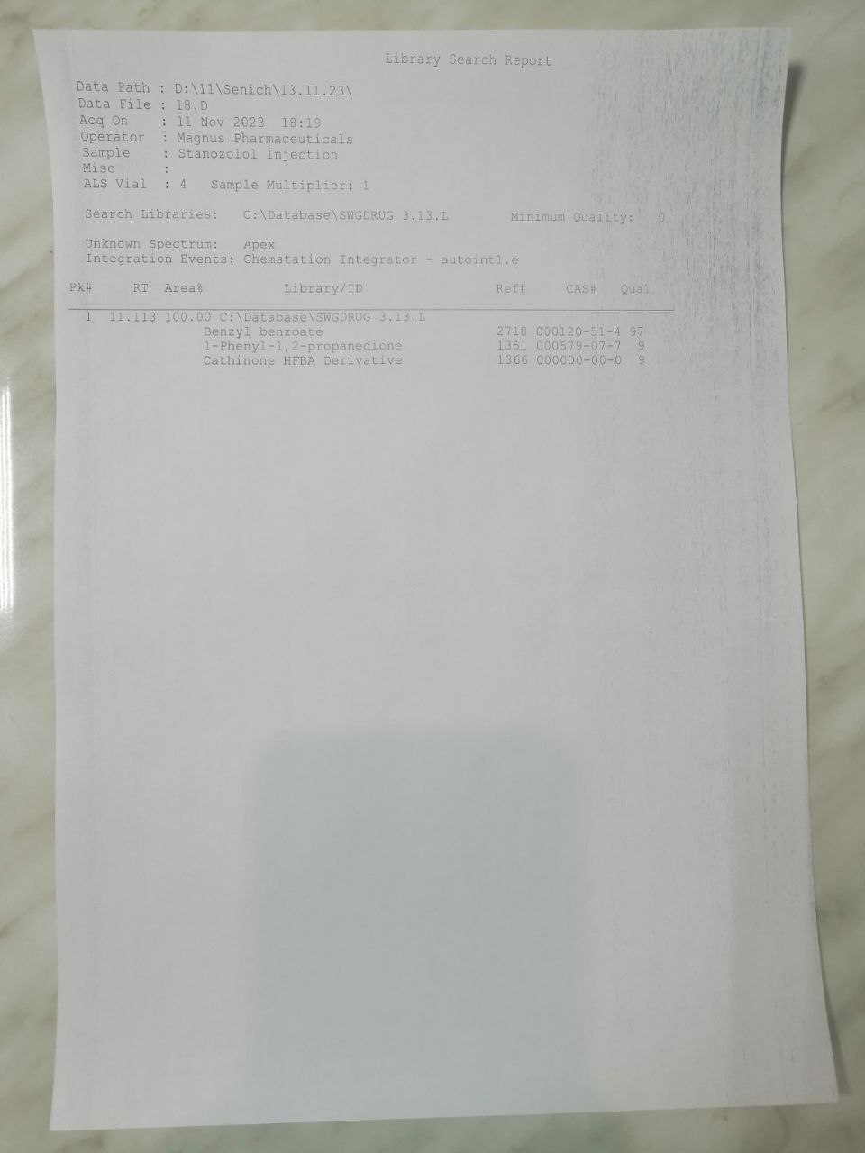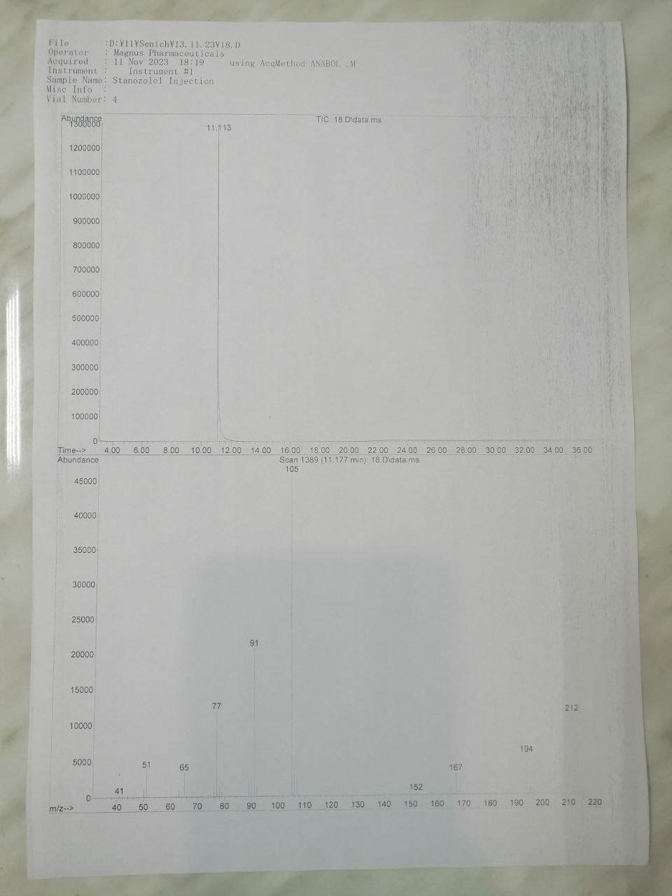 bartid93 Опубликовано 21 ноября, 2023 Автор Опубликовано 21 ноября, 2023 «Magnus Pharmaceuticals” STANOZOLOL INJECTION Batch No: 202106 Образец представляет собой виалу объёмом 10мл. В которой ДВ Станозолол масляный заявлено 50mg/ml. 1) Хроматография: образец НЕ СОДЕРЖИТ СТАНАЗОЛОЛ!!! 2) Масс-спектрометрия: содержание ДВ в образце - - -мг/мл. 3)Посторонние примеси: НЕ ОБНАРУЖЕНЫ.