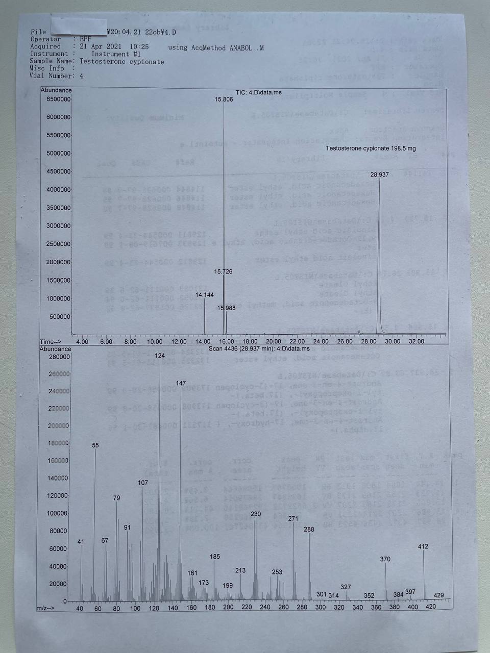 bartid93 Опубликовано 26 апреля, 2021 Автор Опубликовано 26 апреля, 2021 “Adam Labs” BIPROCYNE Образец представляет собой виалу объёмом 10мл. В которой ДВ Тестостерон Ципионат заявлено 200мг/мл. 1) Хроматография: образец содержит Тестостерон Ципионат. 2) Масс-спектрометрия: содержание ДВ в образце ~200мг/мл. 3)Посторонние примеси: НЕ ОБНАРУЖЕНЫ