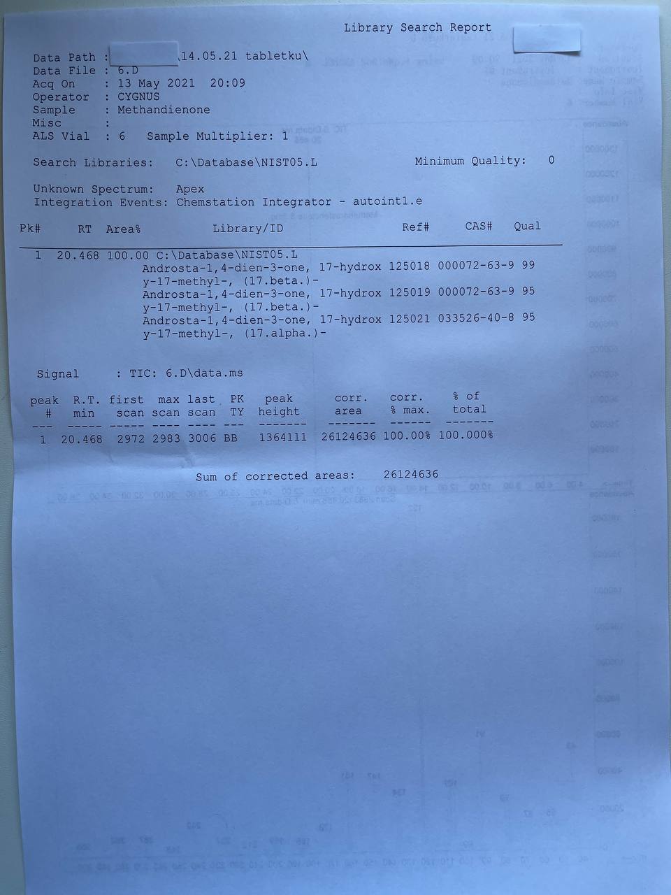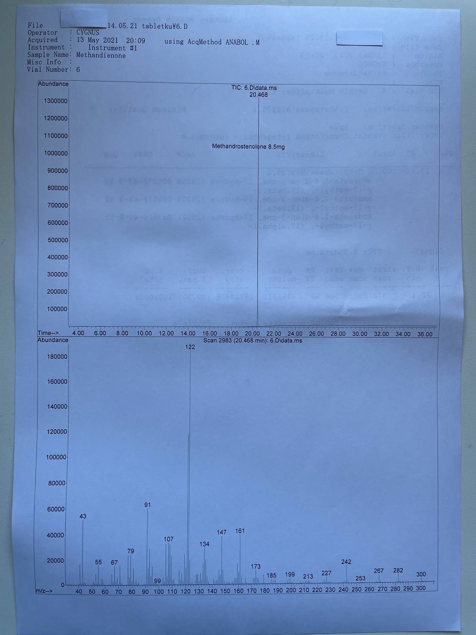 bartid93 Опубликовано 16 мая, 2021 Автор Опубликовано 16 мая, 2021 «Cygnus Pharmaceutical Group» METHANDIENONE Образец представляет собой таблетки белого цвета. В которых ДВ Метандиенон заявлено 10мг/таб. 1) Хроматография: образец содержит Метандиенон. 2) Масс-спектрометрия: содержание ДВ в образце ~8.5мг/таб. 3)Посторонние примеси: НЕ ОБНАРУЖЕНЫ.