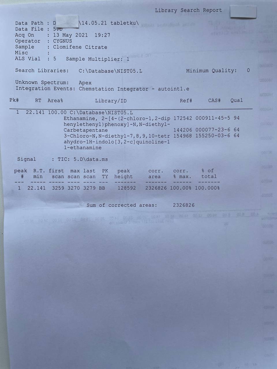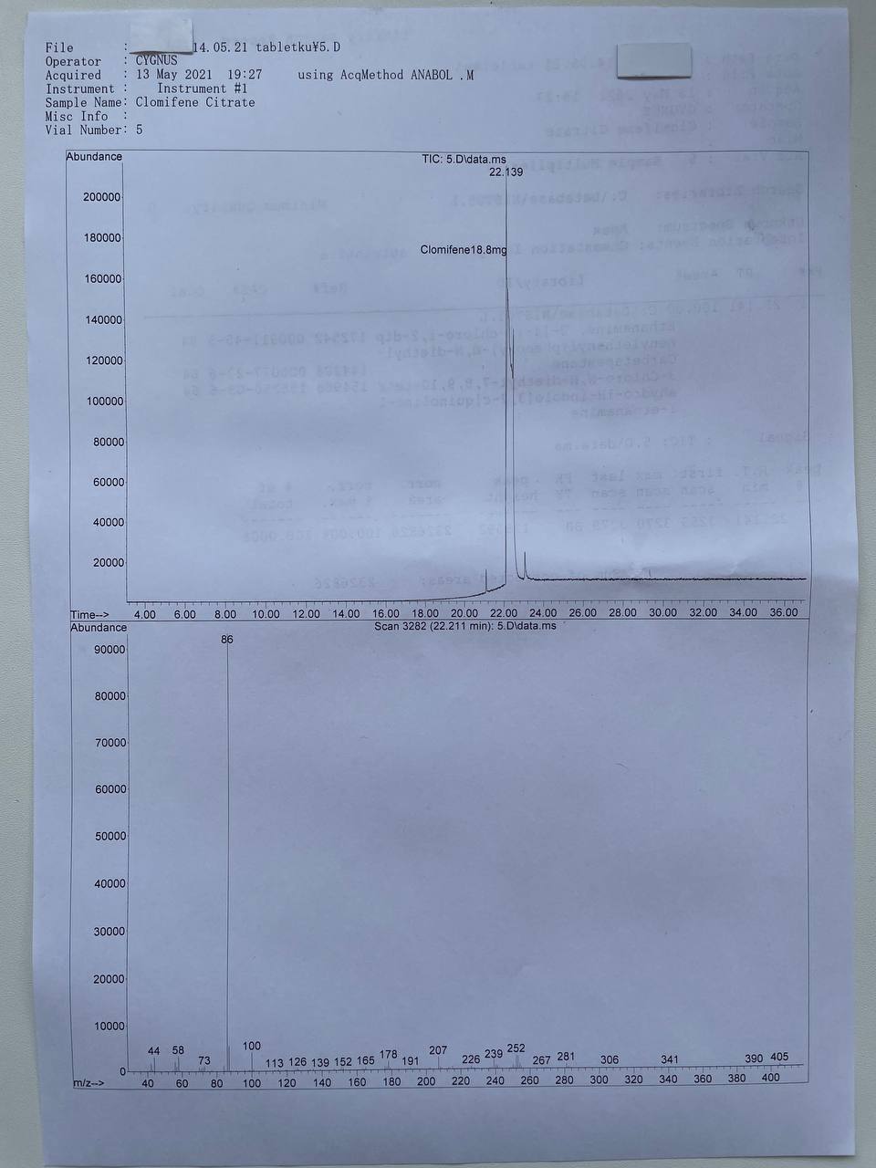 bartid93 Опубликовано 17 мая, 2021 Автор Опубликовано 17 мая, 2021 «Cygnus Pharmaceutical Group» CLOMIPHENE CITRATE Образец представляет собой таблетки белого цвета. В которых ДВ Кломифен Цитрат заявлено 20мг/таб. 1) Хроматография: образец содержит Кломифен Цитрат. 2) Масс-спектрометрия: содержание ДВ в образце ~18.8мг/таб. 3)Посторонние примеси: НЕ ОБНАРУЖЕНЫ.