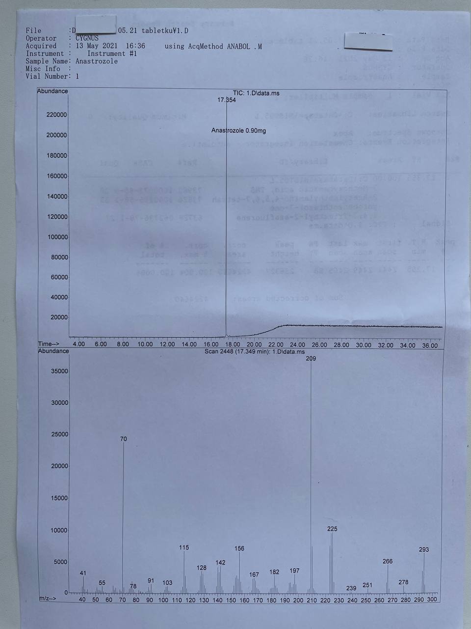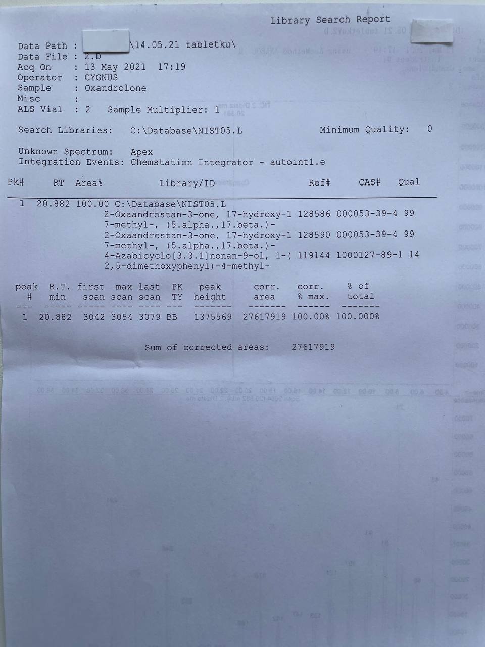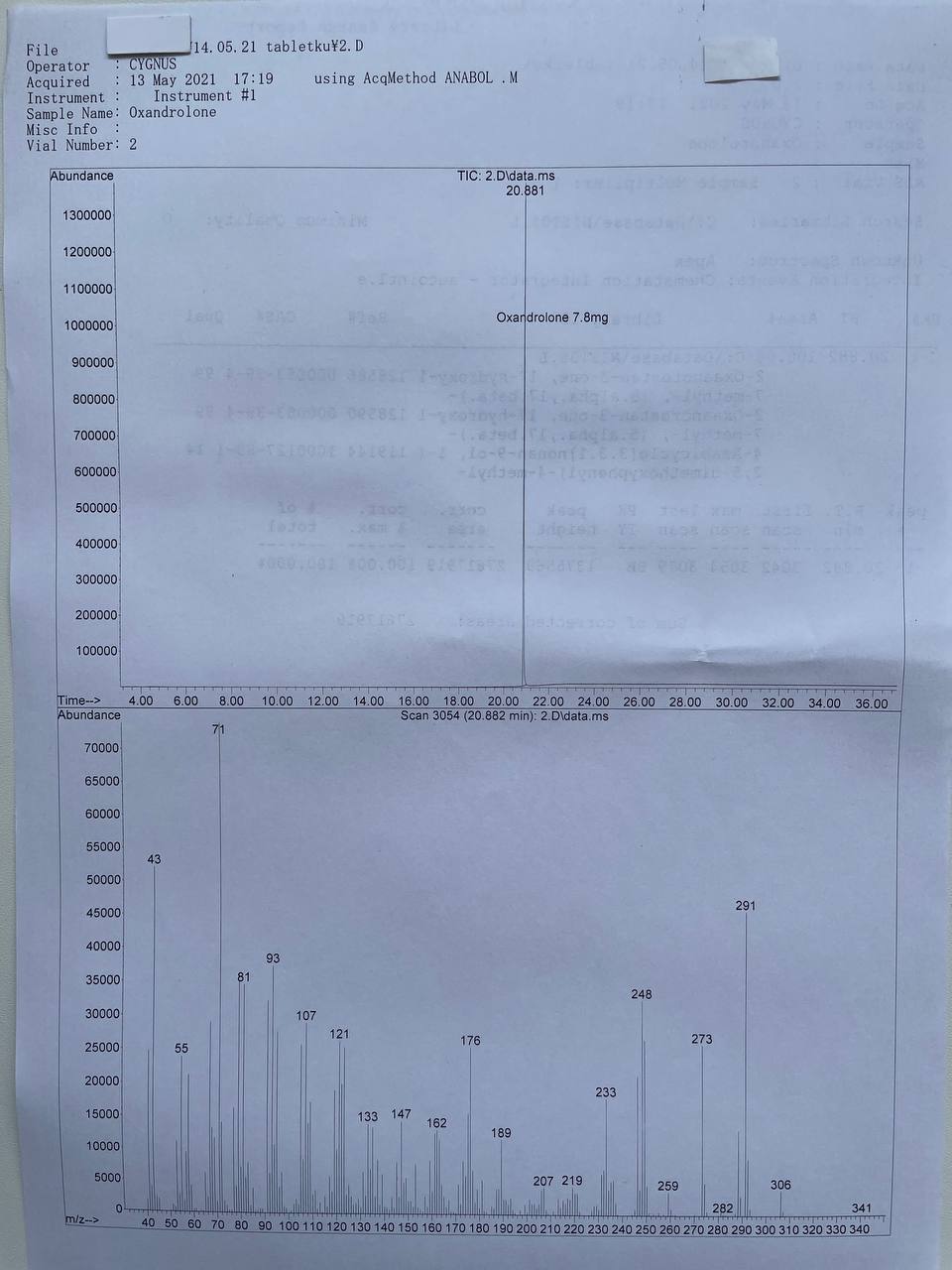 bartid93 Опубликовано 18 мая, 2021 Автор Опубликовано 18 мая, 2021 «Cygnus Pharmaceutical Group»OXANDROLONE Образец представляет собой таблетки белого цвета. В которых ДВ Оксандролон заявлено 10мг/таб. 1) Хроматография: образец содержит Оксандролон. 2) Масс-спектрометрия: содержание ДВ в образце ~7.8мг/таб. 3)Посторонние примеси: НЕ ОБНАРУЖЕНЫ.