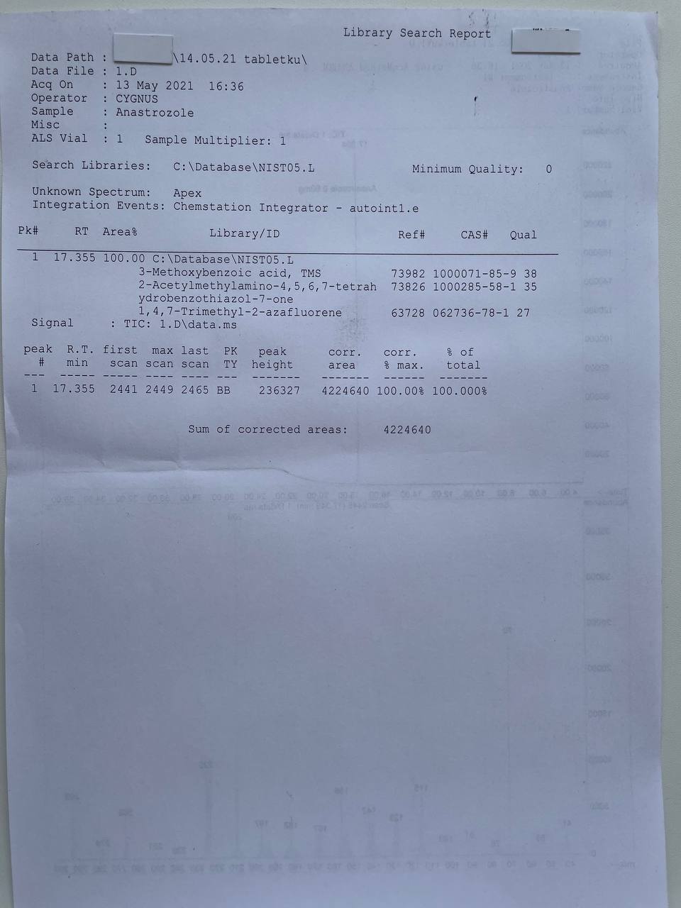 bartid93 Опубликовано 19 мая, 2021 Автор Опубликовано 19 мая, 2021 «Cygnus Pharmaceutical Group» ANASTROZOLE Образец представляет собой таблетки белого цвета. В которых ДВ Анастрозол заявлено 1мг/таб. 1) Хроматография: образец содержит Анастрозол. 2) Масс-спектрометрия: содержание ДВ в образце ~0.90мг/таб. 3)Посторонние примеси: НЕ ОБНАРУЖЕНЫ.