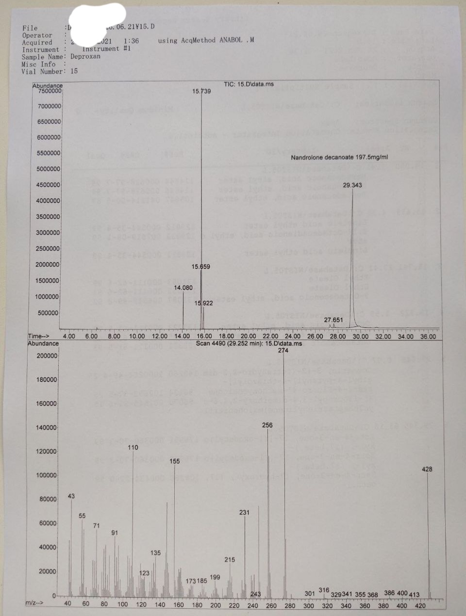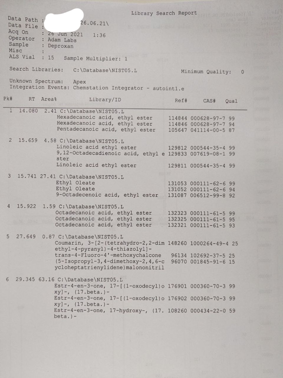 bartid93 Опубликовано 29 июня, 2021 Автор Опубликовано 29 июня, 2021 «Adam Labs” DEPROXAN Образец представляет собой виалу объёмом 10мл. В которой ДВ заявлено Нандролон Деканоат 200мг/мл. 1) Хроматография: образец содержит Нандролон Деканоат. 2) Масс-спектрометрия: содержание ДВ в образце ~197.5мг/мл. 3)Посторонние примеси: НАЙДЕН АНТИКОАГУЛЯНТ "COUMARIN" КУМАРИН.