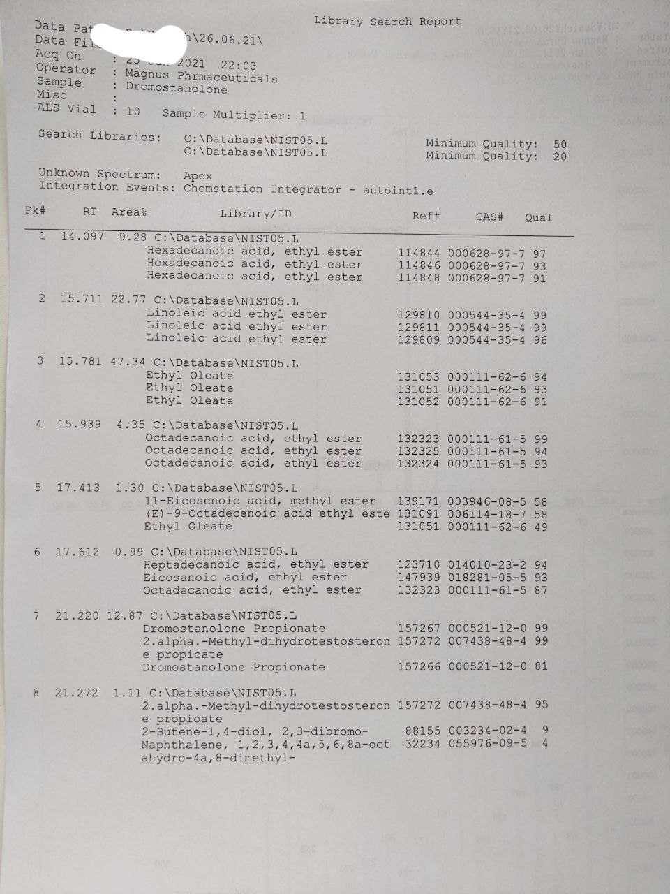 bartid93 Опубликовано 30 июня, 2021 Автор Опубликовано 30 июня, 2021 «Magnus Pharmaceuticals» DROSTANOLONE 100 Образец представляет собой виалу объёмом 10мл. В которой ДВ заявлено Дростанолон Пропионат 100мг/мл 1) Хроматография: образец содержит Дростанолон Пропионат. 2) Масс-спектрометрия: содержание ДВ в образце ~98.2мг/мл. 3)Посторонние примеси: НАЙДЕНО ВЕЩЕСТВО "2 a - METHYL - DIHYDROTESTOSTERONE PRORIONATE" (2 a - Метил - Дигидротестостерон Пропионат)