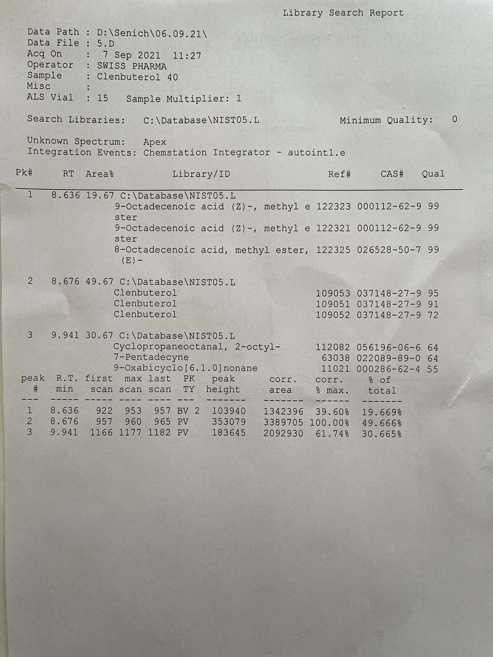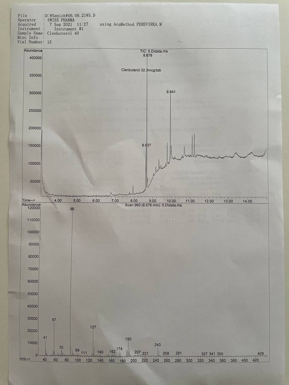 bartid93 Опубликовано 11 сентября, 2021 Автор Опубликовано 11 сентября, 2021 “Swiss Pharma ” CLENBUTEROL 40 Образец представляет собой таблетки желтого цвета. В которой ДВ Кленбутерол Гидрохлорид 40мкг/таб. 1) Хроматография: образец содержит Кленбутерол Гидрохлорид. 2) Масс-спектрометрия: содержание ДВ в образце ~32.3мкг/таб. 3) Посторонние примеси: НЕ ОБНАРУЖЕНЫ