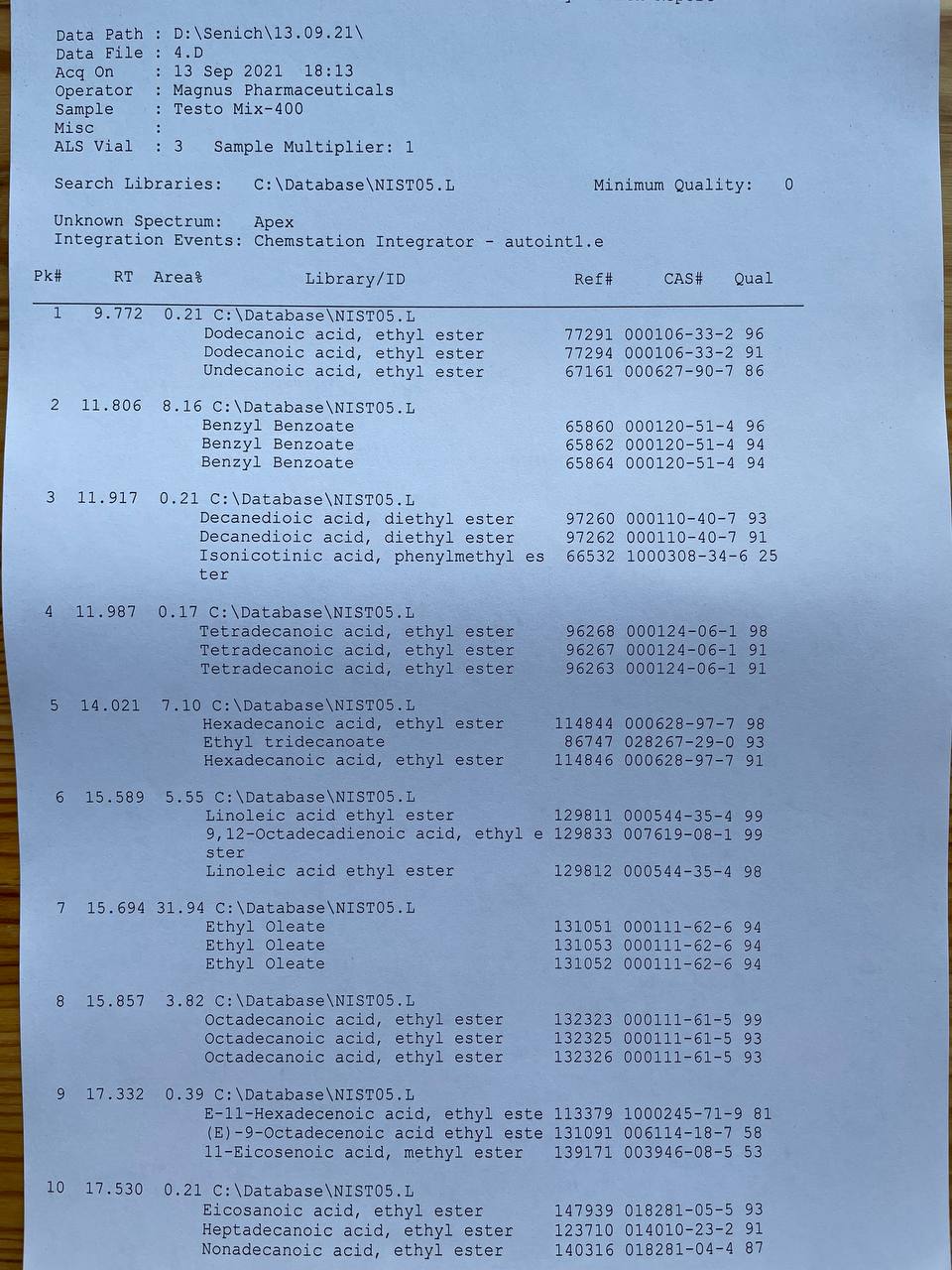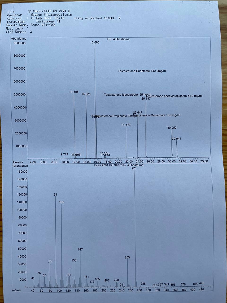 bartid93 Опубликовано 15 сентября, 2021 Автор Опубликовано 15 сентября, 2021 «Magnus Pharmaceuticals» TESTO MIX-400 Batch No: 202008 Образец представляет собой виалу объёмом 10мл. В которой ДВ заявлено Тестостерон Пропионат 30мг/мл Тестостерон Фенилпропионат 60мг/мл Тестостерон Изокапроат 60мг/мл Тестостерон Деканоат 100мг/мл Тестостерон Энантат 150мг/мл 1) Хроматография: образец содержит Тестостерон Пропионат 28мг/мл Тестостерон Фенилпропионат 54.2мг/мл Тестостерон Изокапроат 55мг/мл Тестостерон Деканоат 100мг/мл Тестостерон Энантат 140.2мг/мл 2) Масс-спектрометрия: общее содержание ДВ в образце ~377.4мг/мл. 3)Посторонние примеси: НЕ ОБНАРУЖЕНЫ