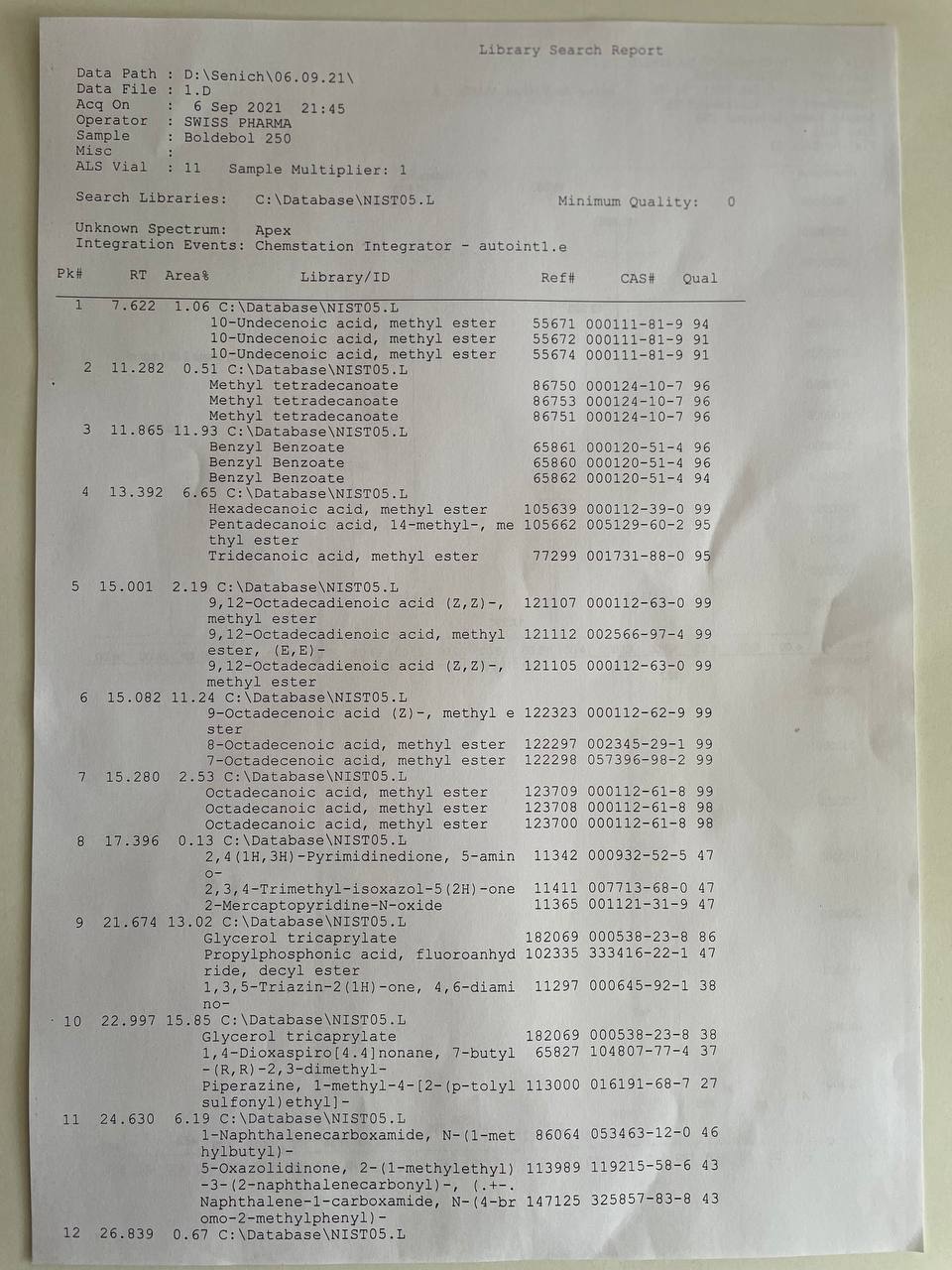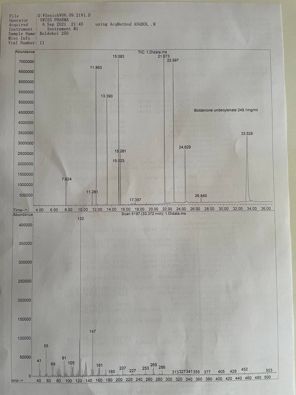 bartid93 Опубликовано 17 сентября, 2021 Автор Опубликовано 17 сентября, 2021 “Swiss Pharma ” BOLDEBOL 250 Образец представляет собой ампулы объёмом 1мл. В которой ДВ Болденон Ундесиленат заявлено 250мг/мл. 1) Хроматография: образец содержит Болденон Ундесиленат. 2) Масс-спектрометрия: содержание ДВ в образце ~249.1мг/мл. 3) Посторонние примеси: НАЙДЕНО ХИМИЧЕСКОЕ СОЕДИНЕНИЕ 1-НАФТАМИД