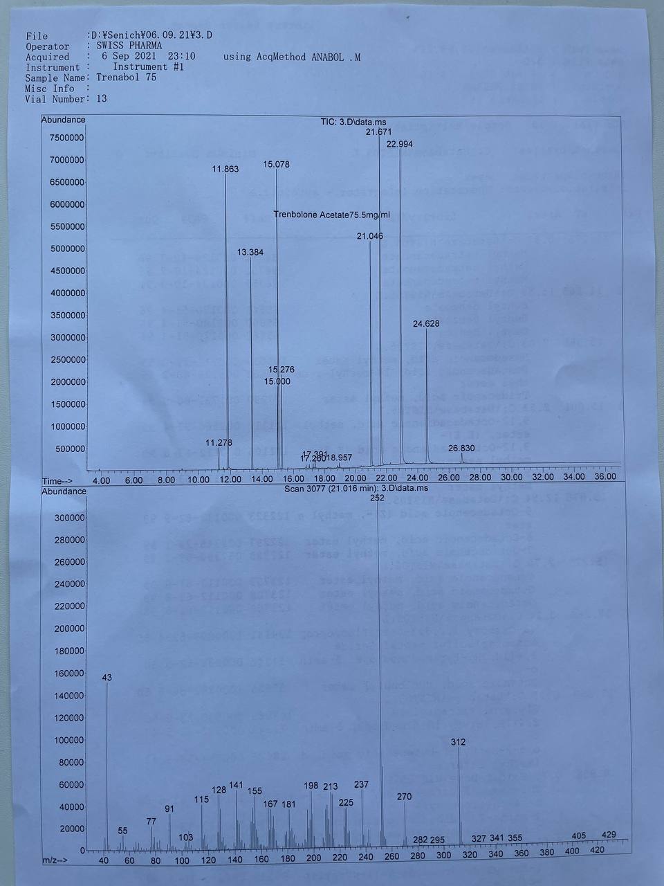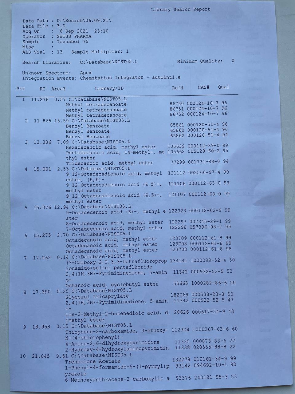 bartid93 Опубликовано 17 сентября, 2021 Автор Опубликовано 17 сентября, 2021 “Swiss Pharma ” TRENABOL 75 Образец представляет собой ампулы объёмом 1мл. В которой ДВ Тренболон Ацетат заявлено 75мг/мл. 1) Хроматография: образец содержит Тренболон Ацетат. 2) Масс-спектрометрия: содержание ДВ в образце ~75.5мг/мл. 3) Посторонние примеси: НАЙДЕН ГЕТЕРОГЕННЫЙ КАТАЛИЗАТОР ТИОФЕН-2-КАРБОКСАМИД