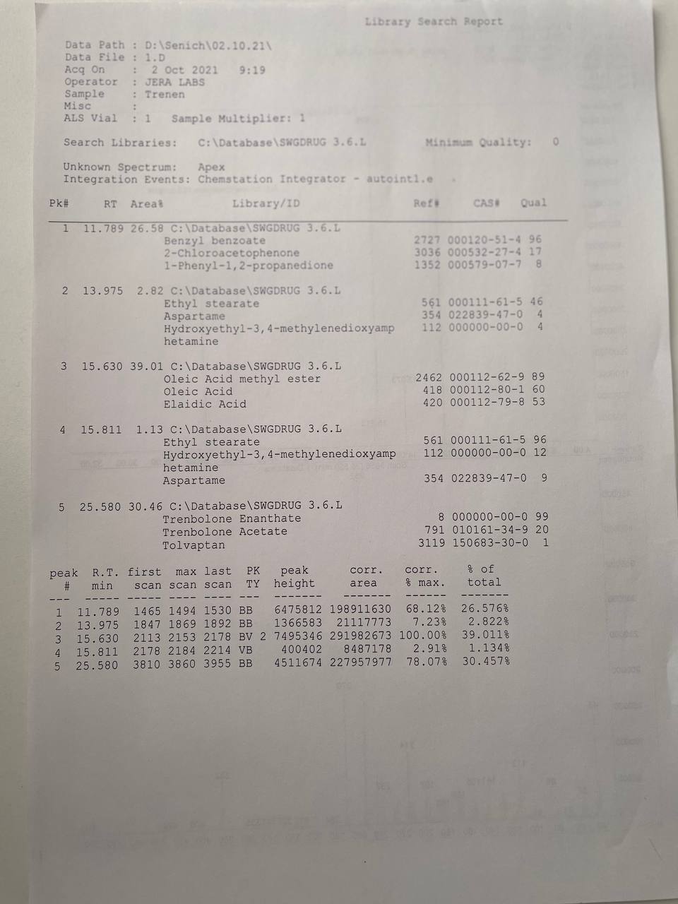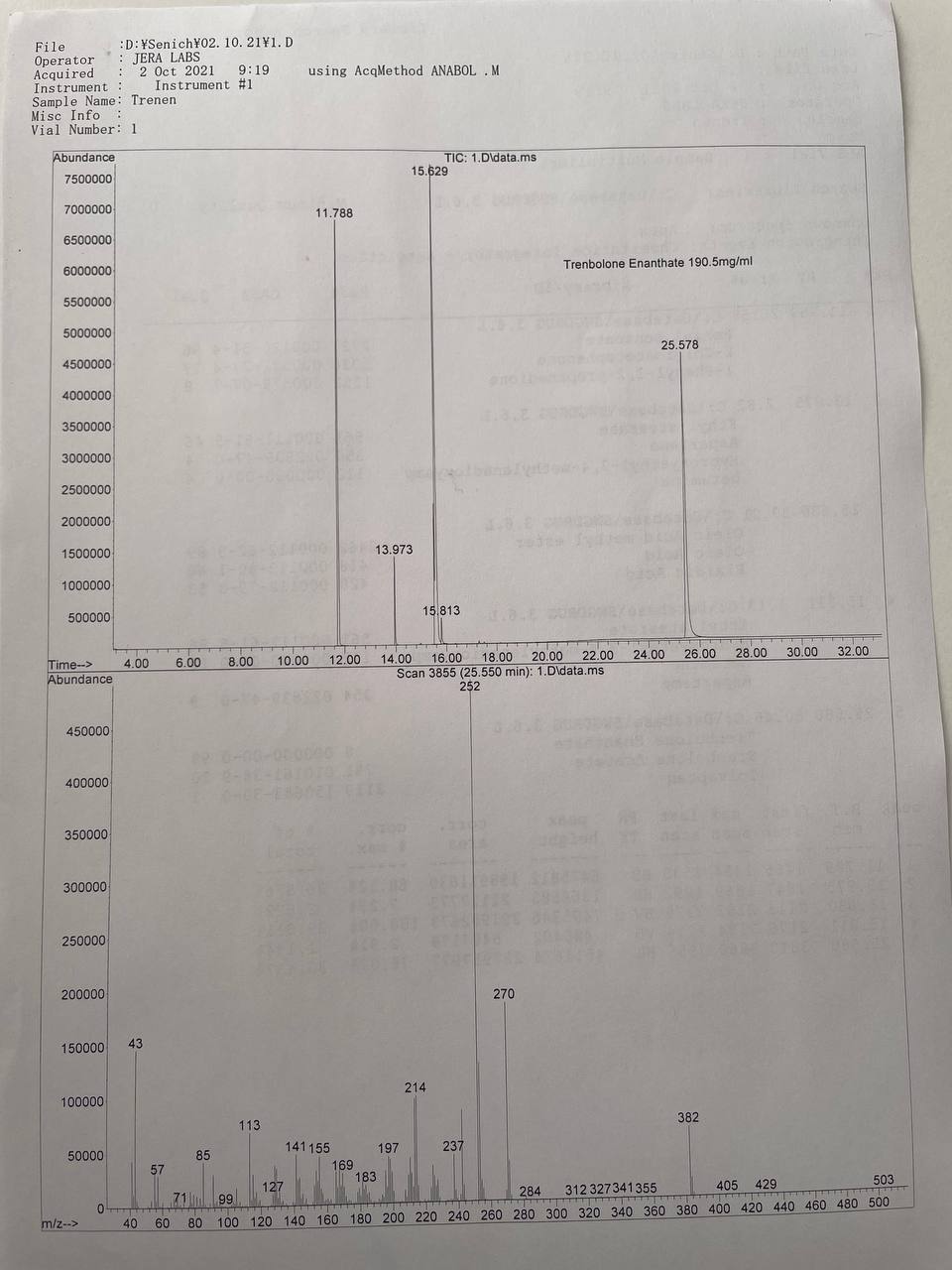 bartid93 Опубликовано 8 октября, 2021 Автор Опубликовано 8 октября, 2021 “Jera Labs” TRENEN Batch number: 25.14 Образец представляет собой ампулы объёмом 1мл. В которой ДВ Тренболон Энантат заявлено 200мг/мл. 1) Хроматография: образец содержит Тренболон Энантат. 2) Масс-спектрометрия: содержание ДВ в образце ~190.5мг/мл. 3) Посторонние примеси: НЕ ОБНАРУЖЕНЫ