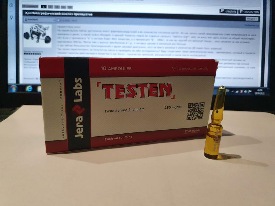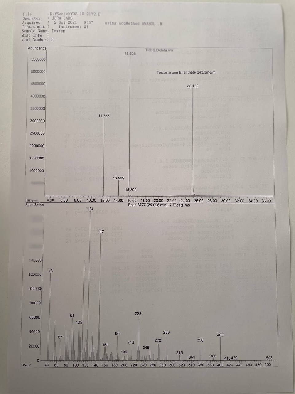 bartid93 Опубликовано 8 октября, 2021 Автор Опубликовано 8 октября, 2021 “Jera Labs” TESTEN Batch number: 55.14 Образец представляет собой ампулы объёмом 1мл. В которой ДВ Тестостерон Энантат заявлено 250мг/мл. 1) Хроматография: образец содержит Тестостерон Энантат. 2) Масс-спектрометрия: содержание ДВ в образце ~243.3мг/мл. 3) Посторонние примеси: НЕ ОБНАРУЖЕНЫ