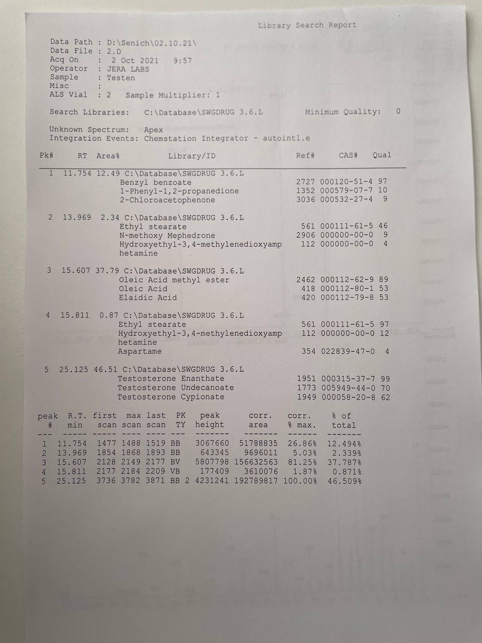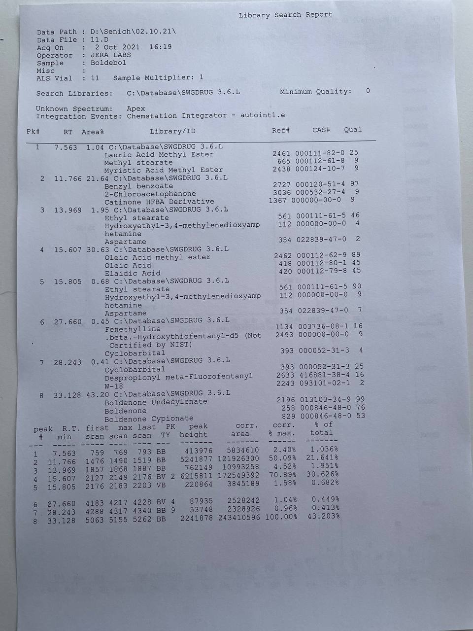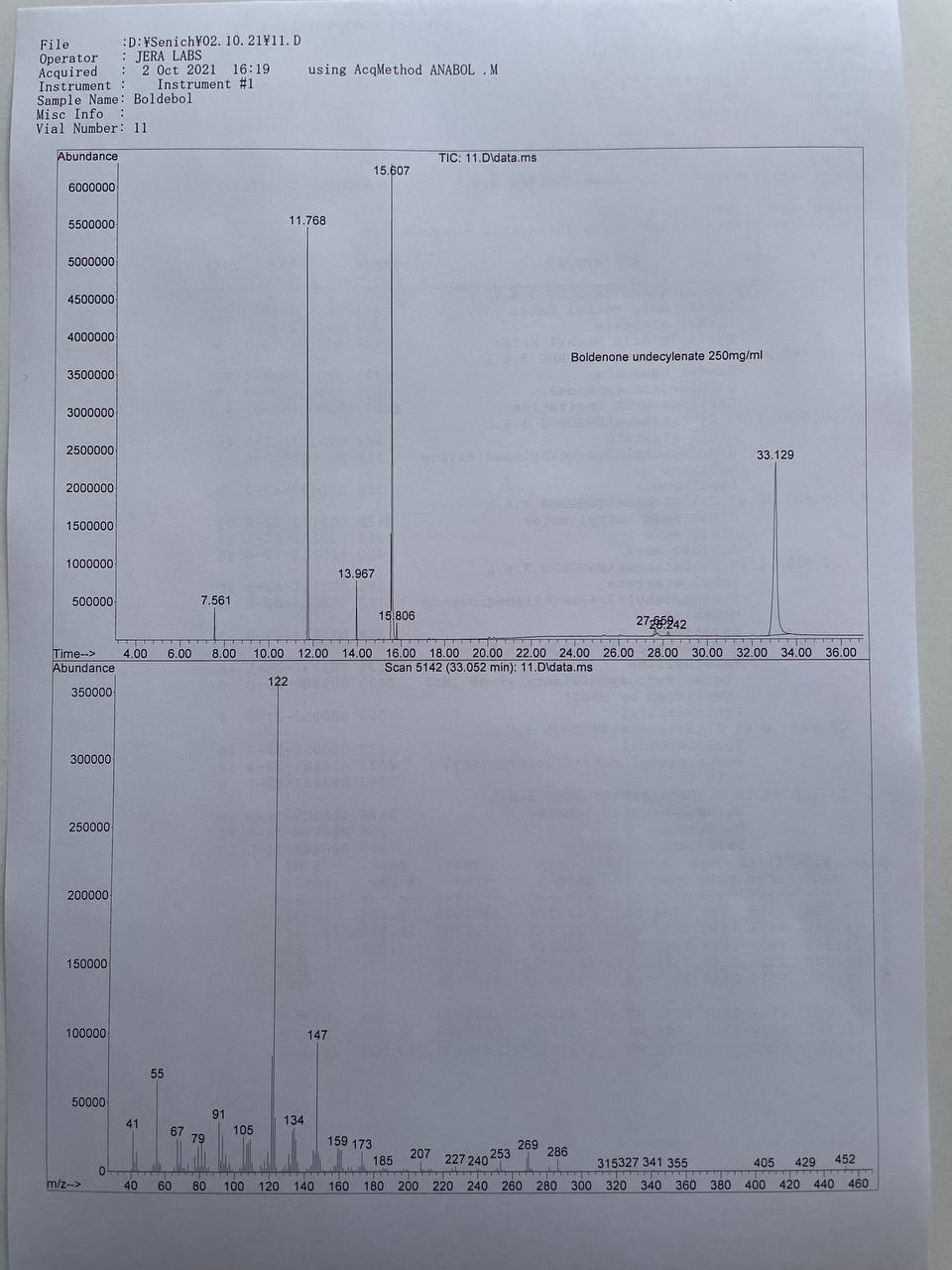bartid93 Опубликовано 8 октября, 2021 Автор Опубликовано 8 октября, 2021 “Jera Labs” BOLDEBOL Batch No: 57.14 Образец представляет собой ампулы объёмом 1мл. В которой ДВ Болденон Ундесиленат заявлено 250мг/мл. 1) Хроматография: образец содержит Болденон Ундесиленат. 2) Масс-спектрометрия: содержание ДВ в образце ~250мг/мл. 3) Посторонние примеси: ОБНАРУЖЕНЫ СЛЕДЫ ФЕНЕТИЛЛИН И ЦИКЛОБАРБИТАЛ.