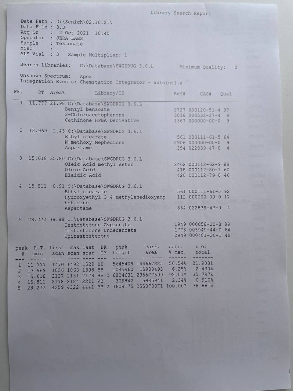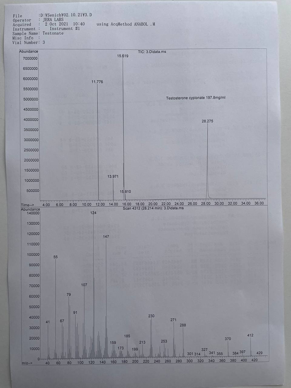 bartid93 Опубликовано 8 октября, 2021 Автор Опубликовано 8 октября, 2021 “Jera Labs” TESTONATE Batch number: 25.14 Образец представляет собой ампулы объёмом 1мл. В которой ДВ Тестостерон Ципионат заявлено 200мг/мл. 1) Хроматография: образец содержит Тестостерон Ципионат. 2) Масс-спектрометрия: содержание ДВ в образце ~197.8мг/мл. 3) Посторонние примеси: НЕ ОБНАРУЖЕНЫ