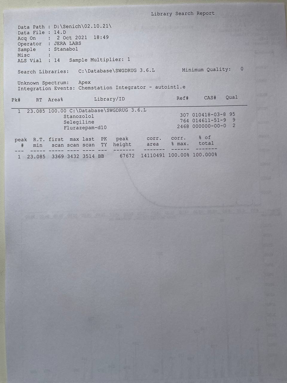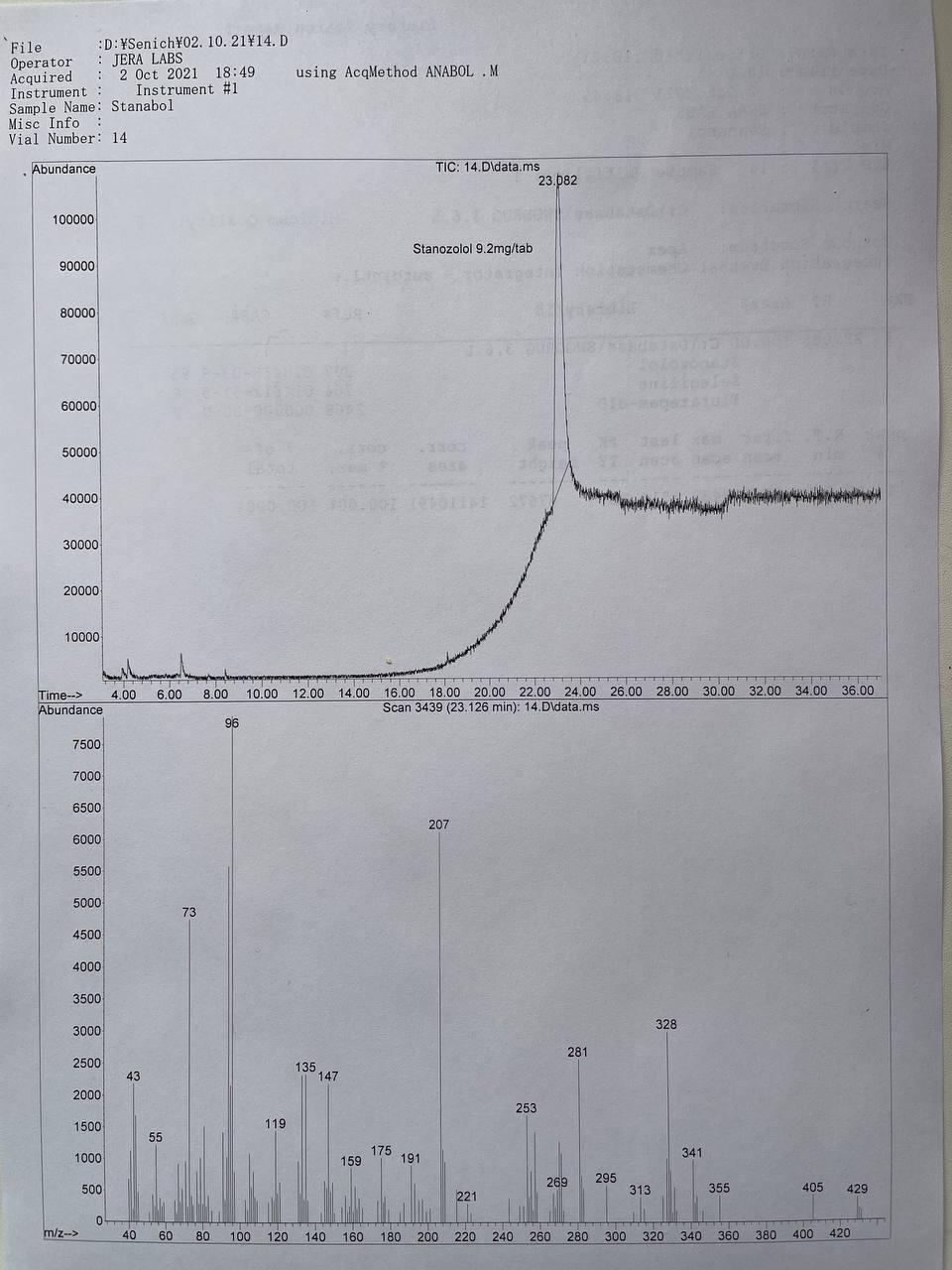 bartid93 Опубликовано 9 октября, 2021 Автор Опубликовано 9 октября, 2021 «Jera Labs» SNANABOL Batch No: XT.14 Образец представляет собой таблетки желтого цвета. В которых ДВ Станозолол заявлено 10мг/таб. 1) Хроматография: образец содержит Станозолол. 2) Масс-спектрометрия: содержание ДВ в образце ~9.2мг/таб. 3)Посторонние примеси: НЕ ОБНАРУЖЕНЫ