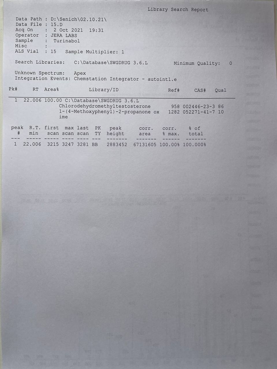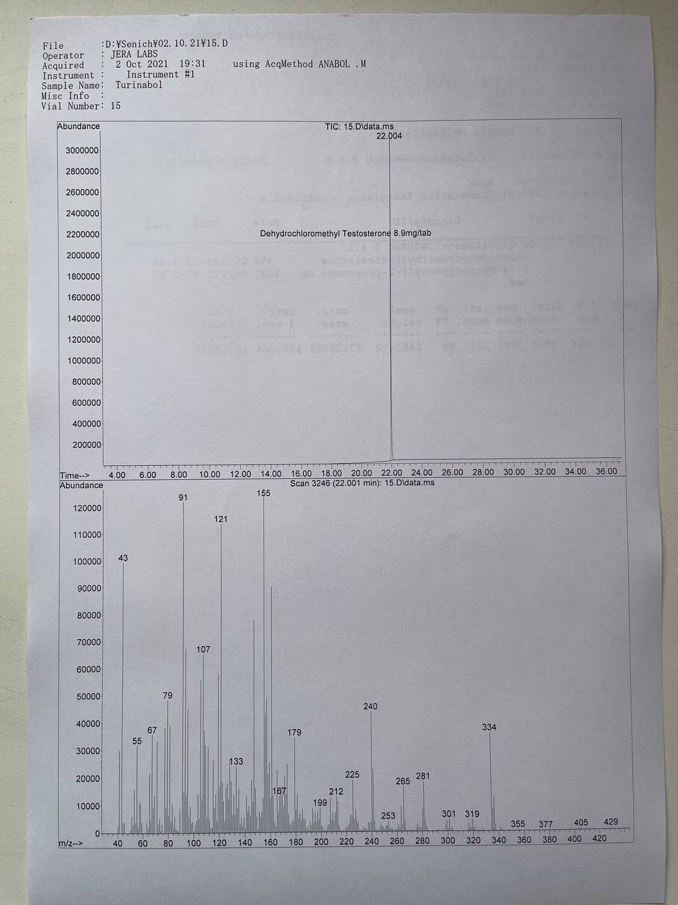 bartid93 Опубликовано 9 октября, 2021 Автор Опубликовано 9 октября, 2021 «Jera Labs» TURINABOL Batch No: DT06 Образец представляет собой таблетки синего цвета. В которых ДВ Хлородегидрометилтестостерон заявлено 10мг/таб. 1) Хроматография: образец содержит Хлородегидрометилтестостерон. 2) Масс-спектрометрия: Содержание ДВ в образце ~ 8.9мг/таб. 3)Посторонние примеси: НЕ ОБНАРУЖЕНЫ.