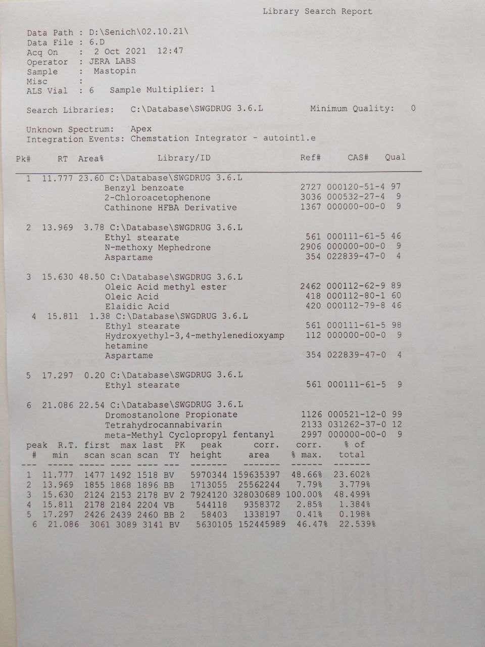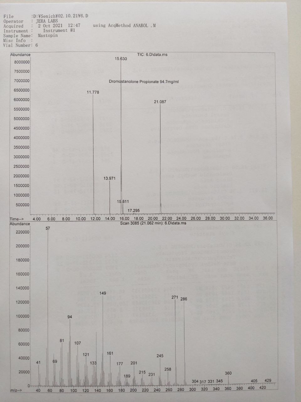 bartid93 Опубликовано 14 октября, 2021 Автор Опубликовано 14 октября, 2021 “Jera Labs” MASTOPIN Batch number: 34.14 Образец представляет собой ампулы объёмом 1мл. В которой ДВ Дростанолон Пропионат заявлено 100мг/мл. 1) Хроматография: образец содержит Дростанолон Пропионат. 2) Масс-спектрометрия: содержание ДВ в образце ~94.7мг/мл. 3) Посторонние примеси: НЕ ОБНАРУЖЕНЫ