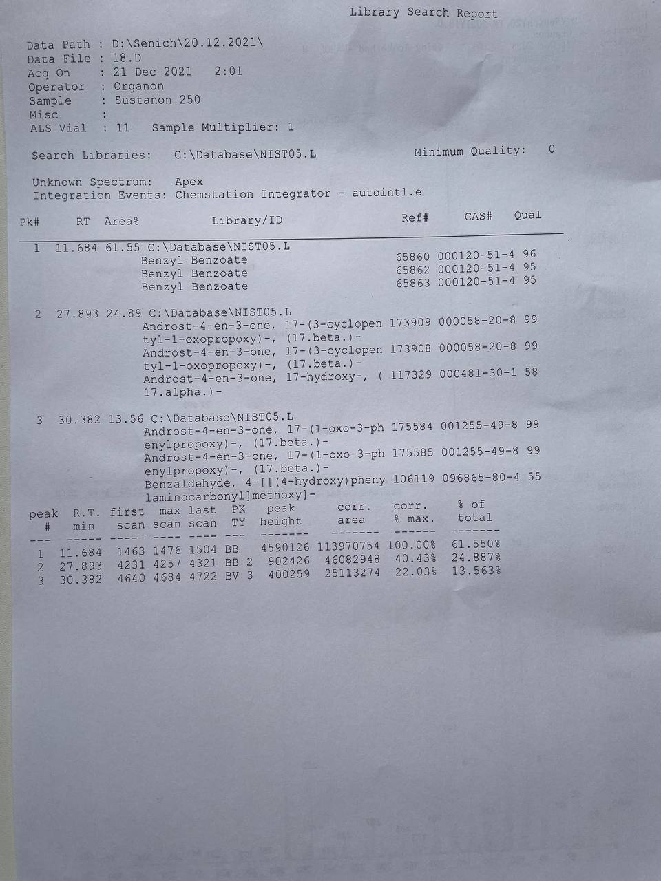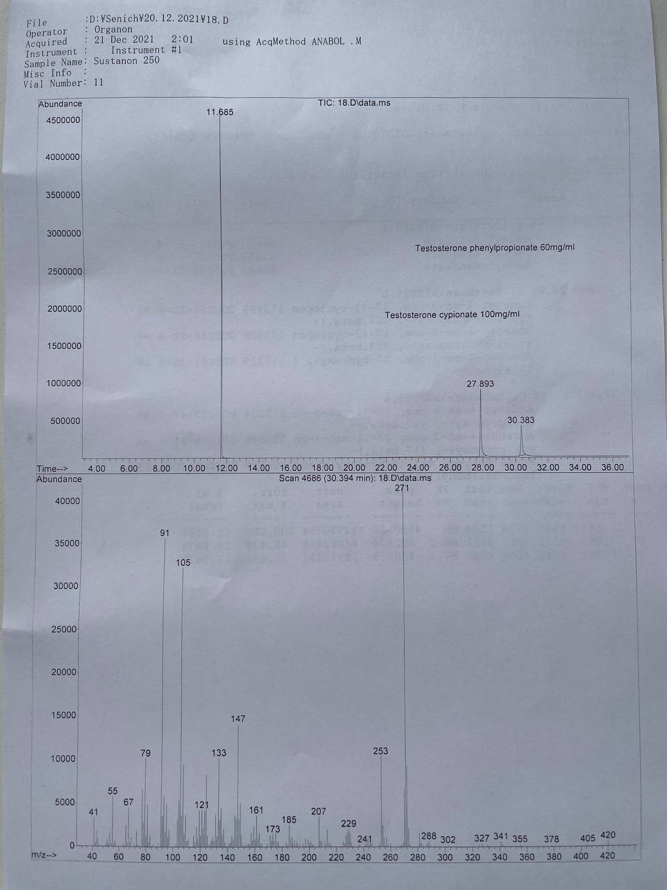bartid93 Опубликовано 22 декабря, 2021 Автор Опубликовано 22 декабря, 2021 «Organon» SUSTANON 250 Batch No: 304521 Образец представляет собой ампулы объёмом 1мл. В которой ДВ заявлено Тестостерон Пропионат 30мг/мл Тестостерон Фенилпропионат 60мг/мл Тестостерон Изокапроат 60мг/мл Тестостерон Деканоат 100мг/мл 1) Хроматография: ОБРАЗЕЦ НЕ СОДЕРЖИТ ТЕСТОСТЕРОН ДЕКАНОАТ! НЕ СОДЕРЖИТ ТЕСТОСТЕРОН ПРОПИОНАТ! НЕ СОДЕРЖИТ ТЕСТОСТЕРОН ИЗОКАПРОАТ! СОДЕРЖИТ: ТЕСТОСТЕРОН ЦИПИОНАТ-100мг/мл! Тестостерон Фенилпропионат 60мг/мл 2) Масс-спектрометрия: общее содержание ДВ в образце ~160мг/мл. 3)Посторонние примеси: НЕ ОБНАРУЖЕНЫ
