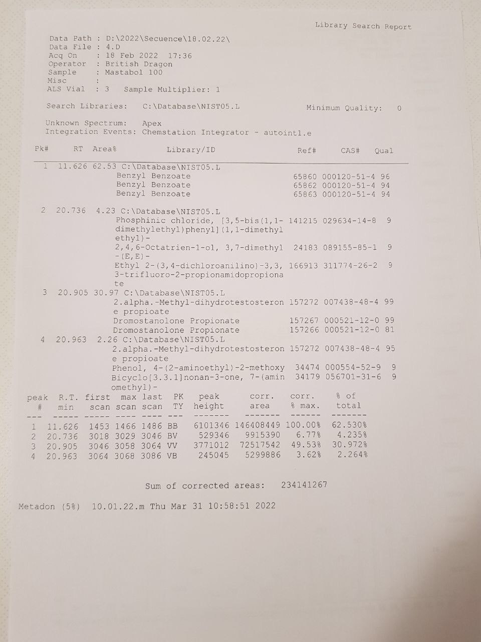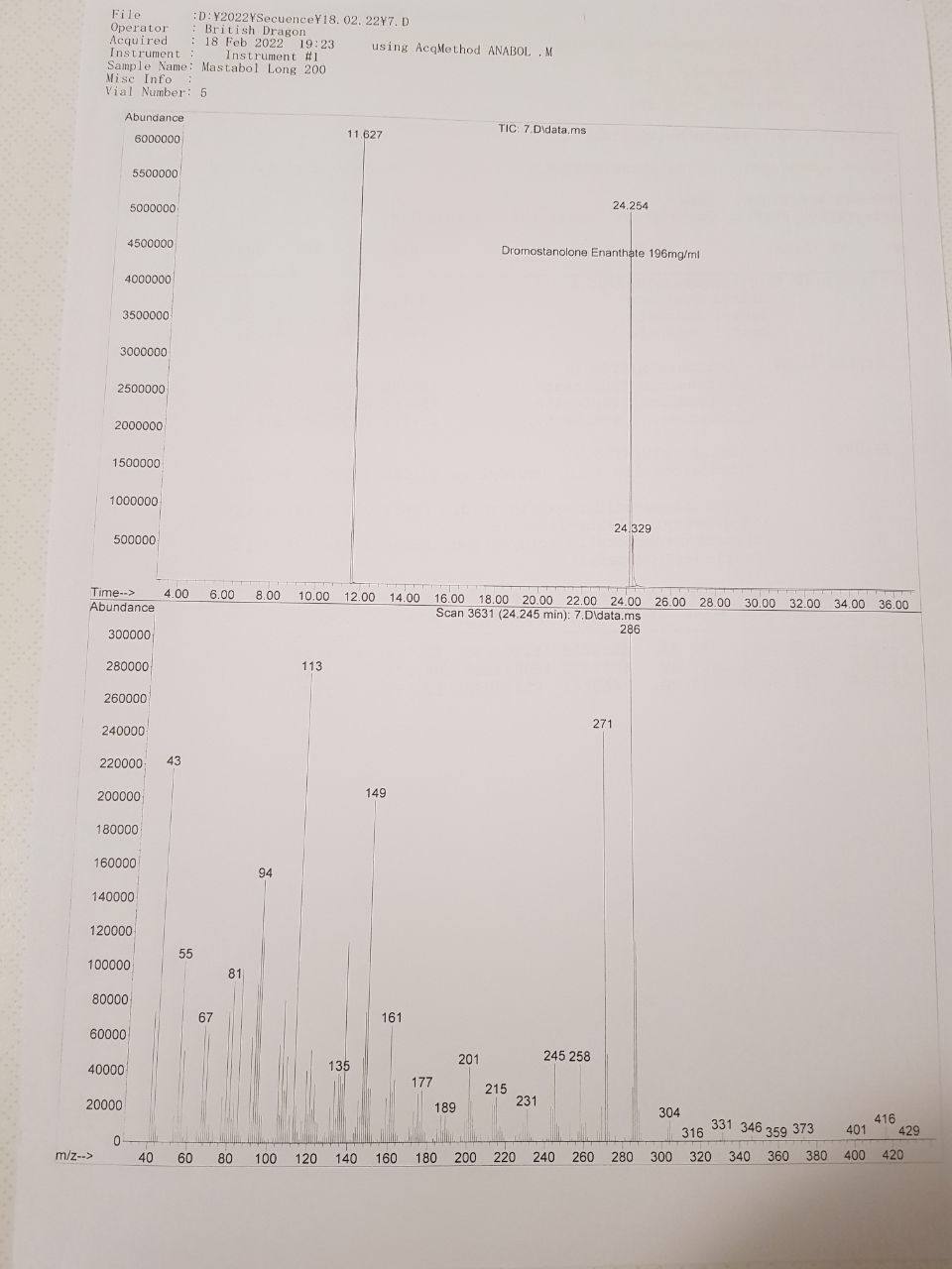 bartid93 Опубликовано 27 апреля, 2022 Автор Опубликовано 27 апреля, 2022 “British Dragon” MASTABOL LONG 200 Образец представляет собой виалу объёмом 10мл. В которых ДВ Дростанолон Энантат заявлено 200мг/мл. 1) Хроматография: образец содержит Дростанолон Энантат. 2) Масс-спектрометрия: содержание ДВ в образце ~196мг/мл. 3) Посторонние примеси: НЕ ОБНАРУЖЕНЫ