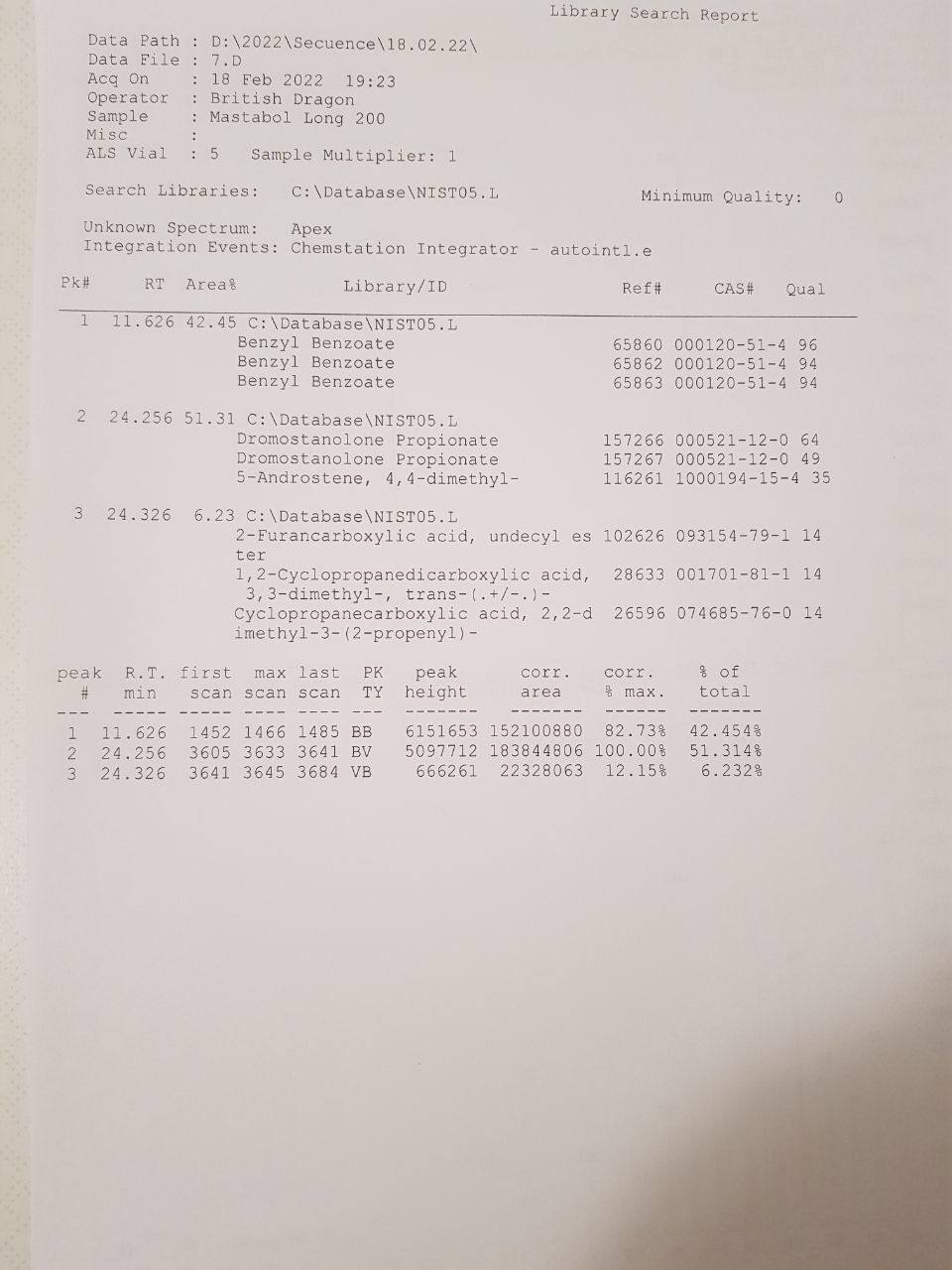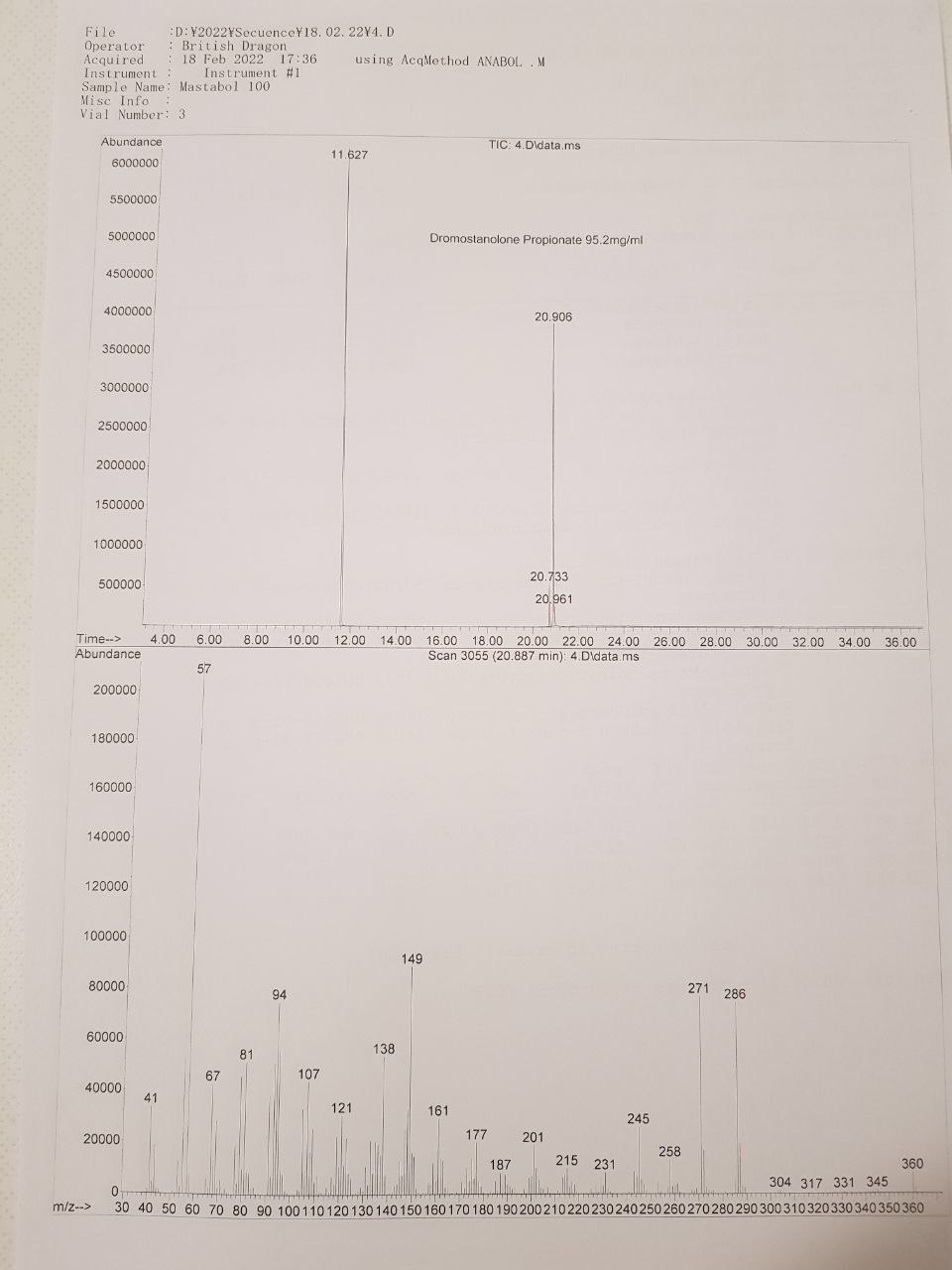 bartid93 Опубликовано 27 апреля, 2022 Автор Опубликовано 27 апреля, 2022 “British Dragon” MASTABOL 100 Образец представляет собой виалу объёмом 10мл. В которых ДВ Дростанолон Пропионат заявлено 100мг/мл. 1) Хроматография: образец содержит Дростанолон Пропионат. 2) Масс-спектрометрия: содержание ДВ в образце ~95.2мг/мл. 3) Посторонние примеси: НАЙДЕН ФОСФИНОВЫЙ ХЛОРИД.
