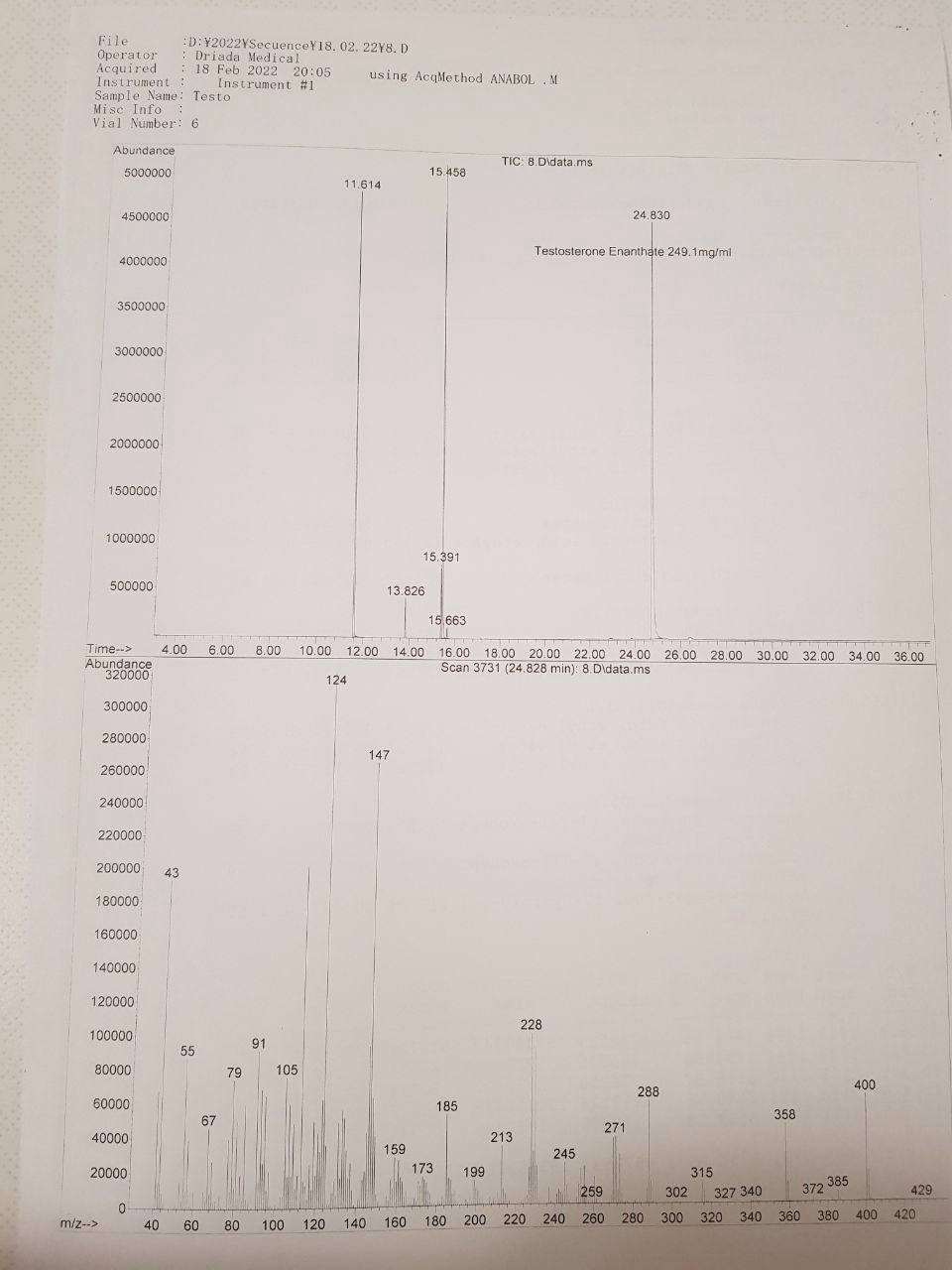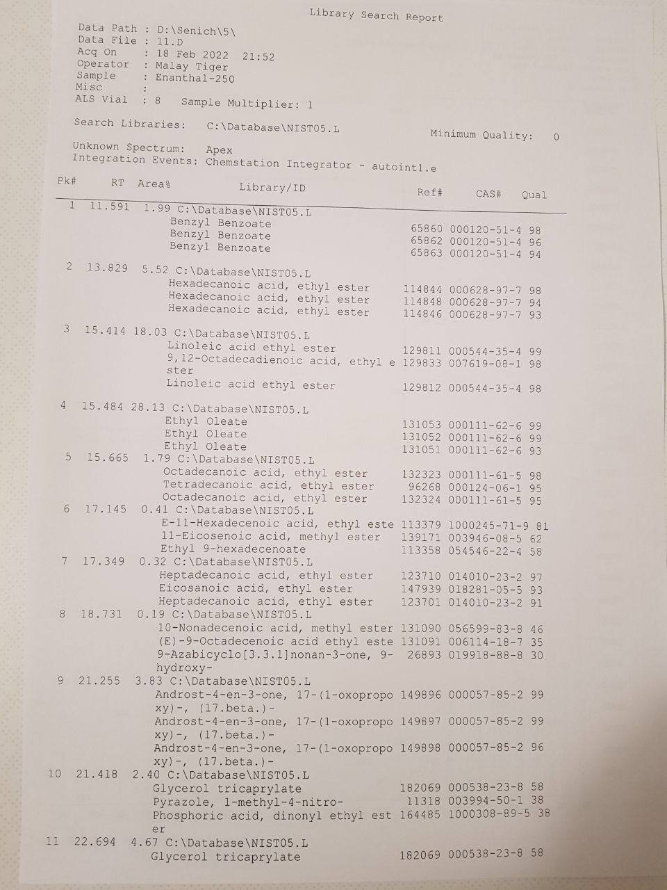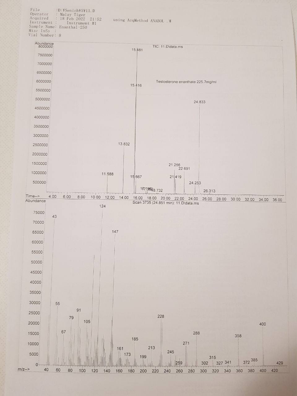 bartid93 Опубликовано 12 мая, 2022 Автор Опубликовано 12 мая, 2022 “Malay Tiger” ENANTHAL-250 Batch No: 017415 Образец представляет собой ампулы объёмом 1мл. В которых ДВ Тестостерон Энантат заявлено 250мг/мл. 1) Хроматография: образец содержит Тестостерон Энантат. 2) Масс-спектрометрия: содержание ДВ в образце ~225.7мг/мл. 3) Посторонние примеси: НЕ ОБНАРУЖЕНЫ