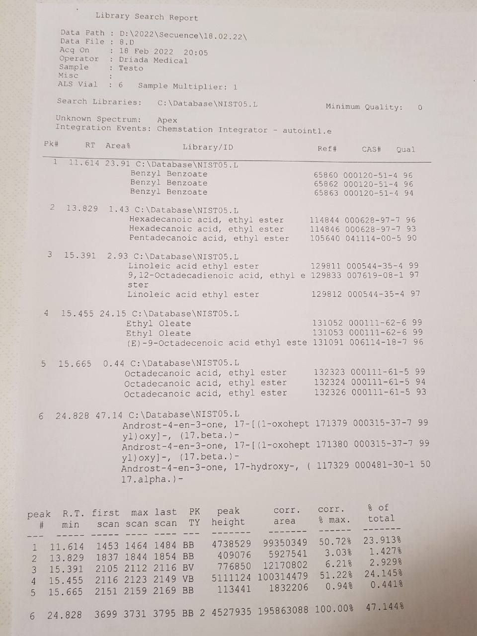 bartid93 Опубликовано 12 мая, 2022 Автор Опубликовано 12 мая, 2022 “Driada Medical” TESTOS Batch No: 407630 Образец представляет собой ампулы объёмом 1мл. В которых ДВ Тестостерон Энантат заявлено 250мг/мл. 1) Хроматография: образец содержит Тестостерон Энантат. 2) Масс-спектрометрия: содержание ДВ в образце ~249.1мг/мл. 3) Посторонние примеси: НЕ ОБНАРУЖЕНЫ