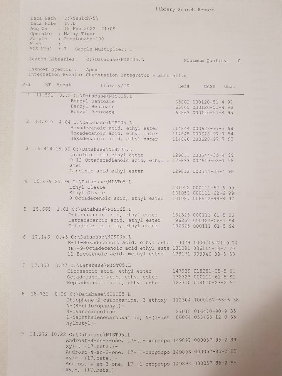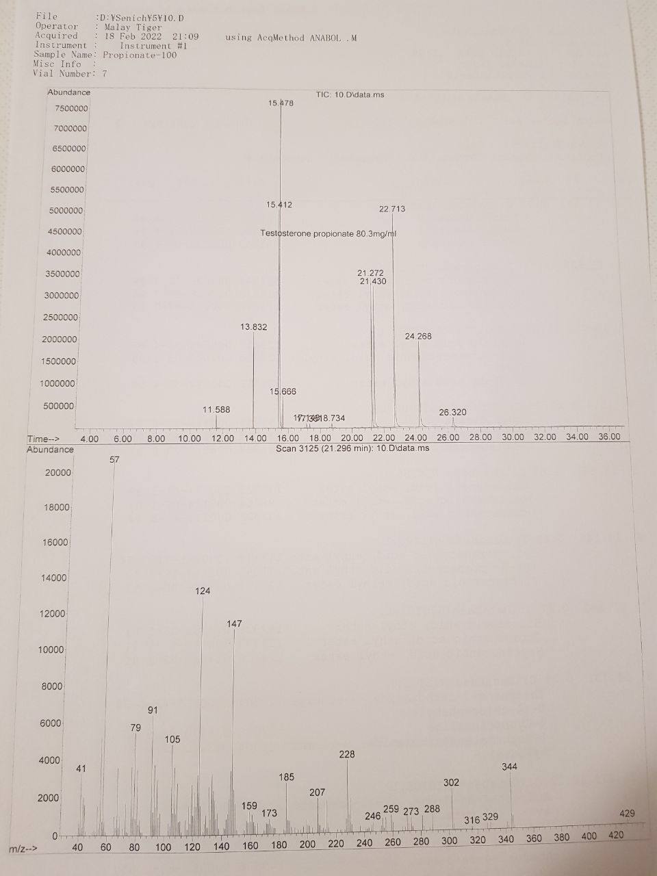bartid93 Опубликовано 12 мая, 2022 Автор Опубликовано 12 мая, 2022 “Malay Tiger” PROPIONATE-100 Batch No: 0086/15 Образец представляет собой ампулы объёмом 1мл. В которых ДВ Тестостерон Пропионат заявлено 100мг/мл. 1) Хроматография: образец содержит Тестостерон Пропионат. 2) Масс-спектрометрия: содержание ДВ в образце ~80.3мг/мл. 3) Посторонние примеси: НАЙДЕНО ХИМИЧЕСКОЕ СОЕДИНЕНИЕ ТИОФЕН-2-КАРБОКСАМИД. НАЙДЕН 4-ДИХЛОРМЕТИЛ-4-МЕТИЛ-2,5-ЦИКЛОГЕКСАДИЕН-1-ОН.