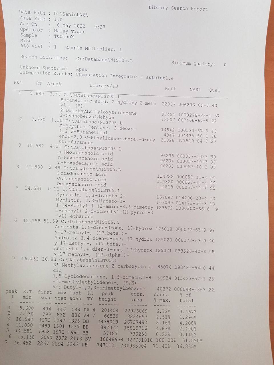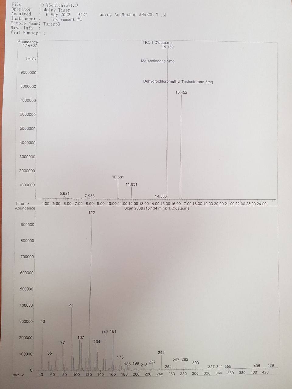 bartid93 Опубликовано 12 мая, 2022 Автор Опубликовано 12 мая, 2022 « Malay Tiger» TURINOX Batch No: 15487-TX Образец представляет собой таблетки белого цвета. В которых ДВ Хлородегидрометилтестостерон заявлено 10мг/таб. 1) Хроматография: образец содержит Хлородегидрометилтестостерон Meтандиенон 2) Масс-спектрометрия: Хлородегидрометилтестостерон- 5мг/таб. Метандиенон- 5мг/таб. Содержание ДВ в образце ~ 10мг/таб. 3)Посторонние примеси: НАЙДЕНА (S)-2-ГИДРОКСИ-2-МЕТИЛЯРНАЯ КИСЛОТА. НАЙДЕН ГИДРОКСИАЛЬДЕГИД D-ЭРИТРО-ПЕНТОЗА, 2-ДЕЗОКСИ- НАЙДЕНА ПАЛЬМИТИНОВАЯ КИСЛОТА. НАЙДЕНО ХИМИЧЕСКОЕ СОЕДИНЕНИЕ МИРИСТИН, 1,3-ДИАЦЕТО-2-