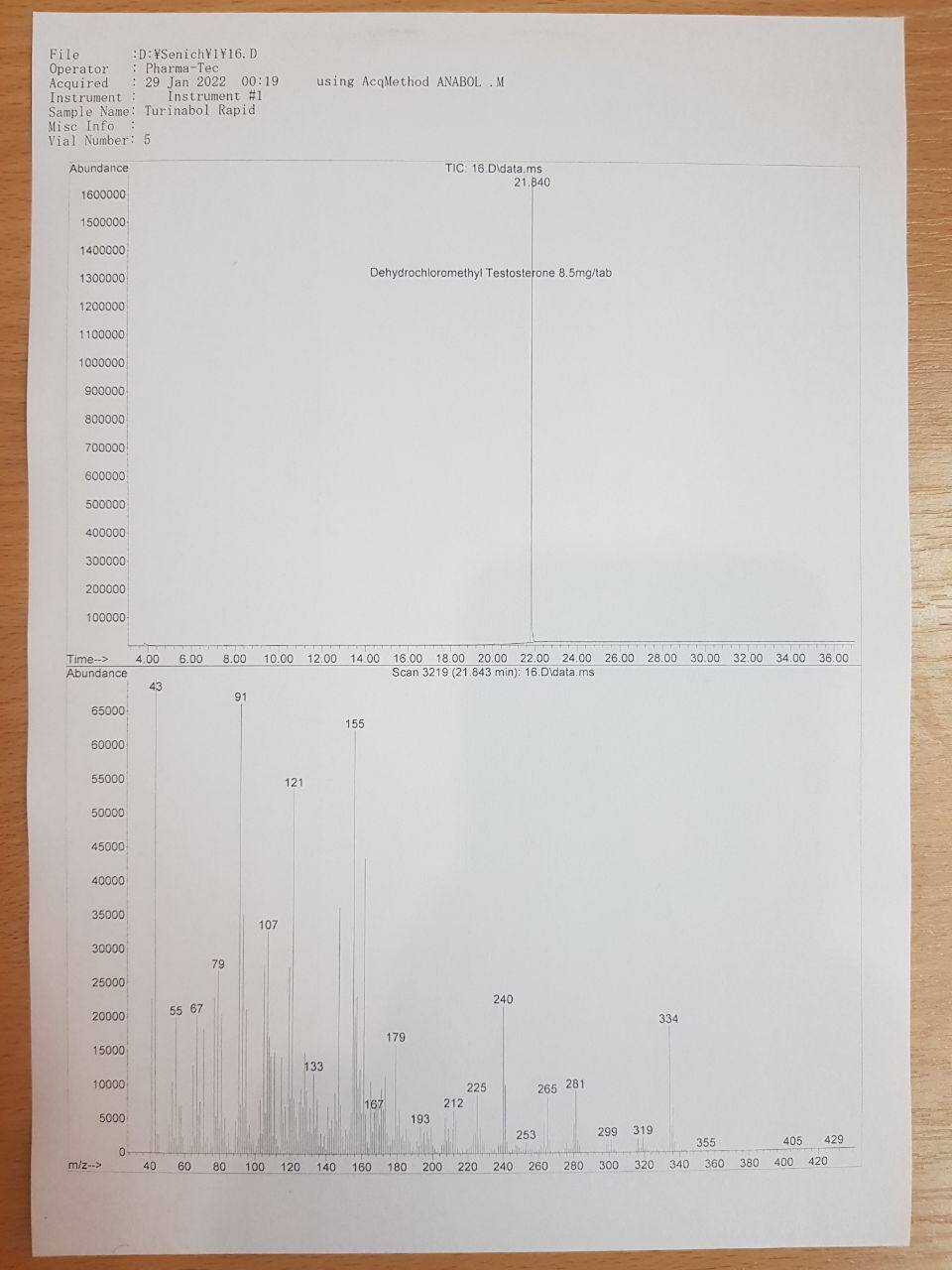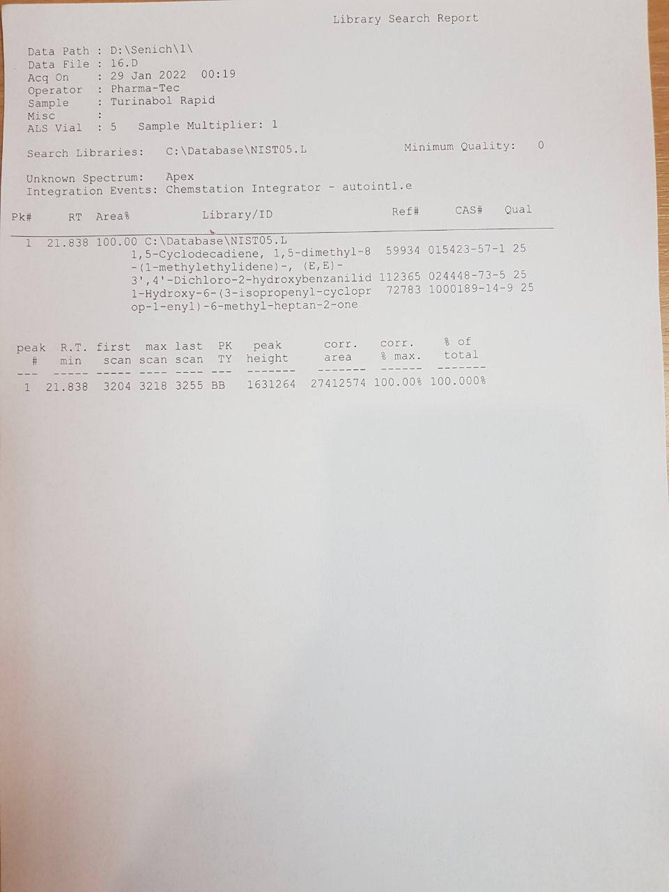 bartid93 Опубликовано 12 мая, 2022 Автор Опубликовано 12 мая, 2022 «Pharm-Tec» TURINABOL RAPID Образец представляет собой таблетки белого цвета. В которых ДВ Хлородегидрометилтестостерон заявлено 10мг/таб. 1) Хроматография: образец содержит Хлородегидрометилтестостерон. 2) Масс-спектрометрия: Содержание ДВ в образце ~ 8.5мг/таб. 3)Посторонние примеси: НЕ ОБНАРУЖЕНЫ.