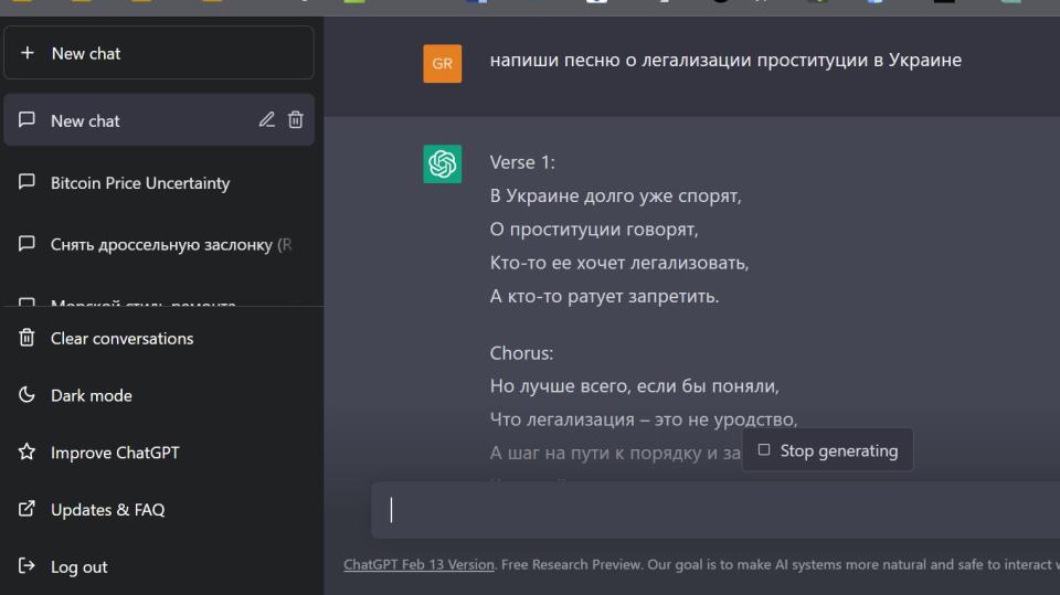 OlegRO Опубликовано 18 февраля, 2023 Опубликовано 18 февраля, 2023 Работает) Написал мне песню ПоказатьVerse 1:В Украине долго уже спорят, О проституции говорят, Кто-то ее хочет легализовать, А кто-то ратует запретить. Chorus: Но лучше всего, если бы поняли, Что легализация – это не уродство, А шаг на пути к порядку и закону, Который сделает жизнь лучше и для всех нас. Verse 2: Проститутки сегодня живут, В тени, их работа не легальна, Но если бы их работа была законна, То они могли бы жить спокойнее. Chorus: Но лучше всего, если бы поняли, Что легализация – это не уродство, А шаг на пути к порядку и закону, Который сделает жизнь лучше и для всех нас. Verse 3: Контроль за работой был бы жестче, А также за здоровьем и безопасностью, И вместо того, чтобы прятаться в углах, Девушки смогут работать на виду у всех. Chorus: Но лучше всего, если бы поняли, Что легализация – это не уродство, А шаг на пути к порядку и закону, Который сделает жизнь лучше и для всех нас. Verse 4: Давайте думать об этом серьезно, И не бояться этого слова, Легализация – это не табу, А всего лишь шаг на пути к свободе. Chorus: Но лучше всего, если бы поняли, Что легализация – это не уродство, А шаг на пути к порядку и закону, Который сделает жизнь лучше и для всех нас.