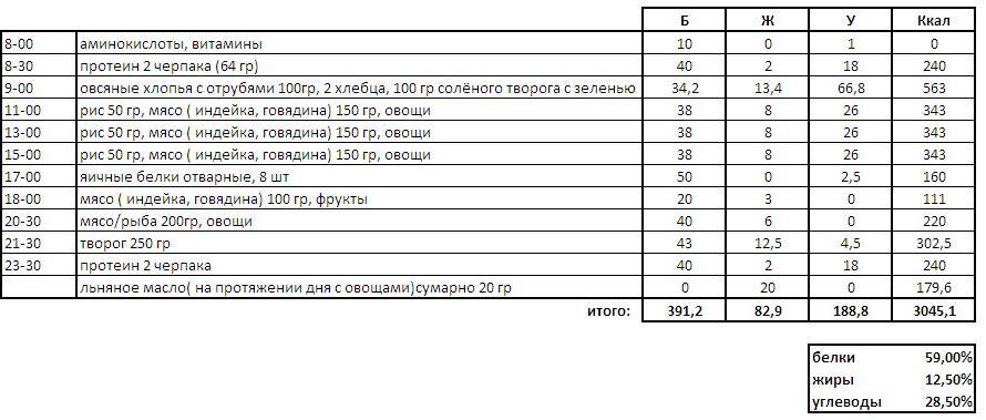 Меченый Опубликовано 20 ноября, 2014 Опубликовано 20 ноября, 2014 да абсолютно всё равно, решающее значение за суточным объемом Суточный объём конечно важен, но и частота приёма тоже важна. Вот на своём примере: 35 лет Рост 178 вес 106 За день набираю 3000-3100 Ккал, из них белков около 60%, углей 28, жиров 12. Всё это за 5 приёмов пищи. С таким кол-вом калорий, 3 тренировки в неделю, без применения мультивитаминок, я либо медленно набираю, либо вес держится на месте, в зависимости от тренировок. Полтора месяца назад получил травму плеча, сейчас грубо все тренировки - это ноги и кардио, иногда тяги, но не много и без фанатизма, жимы вообще делать не могу. Раз уж полноценно заниматься не могу, решить сгонять вес, тем более, что сгонять есть что))). Весь рацион оставил тот же, разбил на мелкие порции и стал чаще питаться, основные приёмы каждых 2 часа. Медленно, но стабильно теряю вес, где то по 1 кг в неделю, вчера утром весы показали заветные 99.5))), т.е. по утрам я уже покидаю клуб тех, кто за 100:), вечером взвешивание показывает 100,5-101 кг. Продукты те же, соотношение БЖУ то же самое, калорий столько же, всё без фармы. Кому интересно, во вложении график питания и рацион на котором я худею