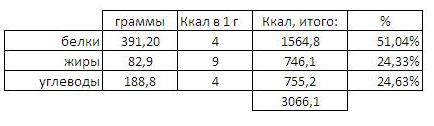 Меченый Опубликовано 20 ноября, 2014 Опубликовано 20 ноября, 2014 Процентный состав макронутриентов считается не в пропорциях к общему весу (662.9 г), а в пропорциях к общему калоражу (3045 ккал). Пересчитал процентный состав по калориям. Получается белков 51, остальное по 24 с мелочью:). Получается по жирам у меня перебор небольшой, обрежу немного. По углям типа тоже мало, но я сбрасываю вес. А, ещё забыл важный момент, по субботам типа углеводная загрузка, позволяю себе блинчики от тёщи, картошечку и т.д.)))