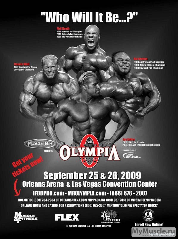 Admin Опубликовано 12 сентября, 2009 Автор Опубликовано 12 сентября, 2009 Нашел где будет проходить трансляция. Тыць. Бодибилдинг.ком дает такие прогнозы: 1. Фил Хит. 2. Кай Грин 3. Декстк Джексон. 4. Джей Катлер. 5. Виктор Мартинез. 6. Деннис Вульф. 7. Тони Фримен. 8. Мелвин Энтони. Мне кажется, что Декстер может выше прыгнуть и Мартинез, если будет в хорошей форме.
