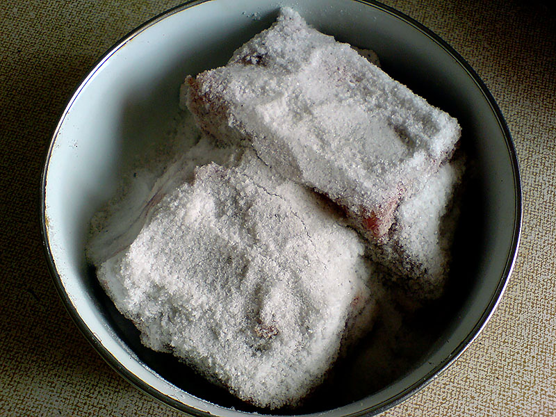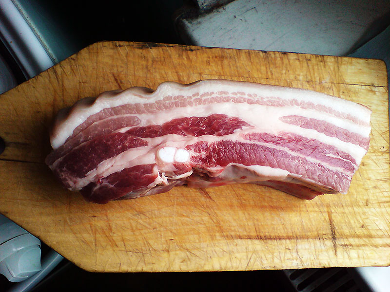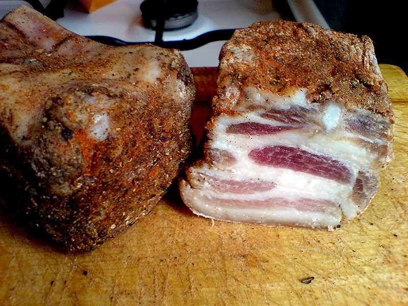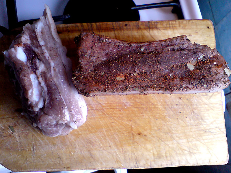 Garon Опубликовано 10 января, 2016 Опубликовано 10 января, 2016 Свиная грудинка а-ля сыровяленая. Грудинку натереть солью, можно чеснока надавить тоже и втереть. Контейнеров перед новым годом свободных не оказалось и пришлось разделить на две части. Недели на 2-3 отправить скучать в холодильник на дальнюю от морозилки полку. После обтереть от соли и натереть смесью приправ,перцев,лаврушкой. Замотать в марлю и в проветриваемое место, у меня над вытяжкой получается возле окна - снизу тепло, а сбоку обдув. Можно обвернуть зеленью(укропом) и завернуть в пергамент и опять в холодильник, но дольше ждать придется, но более провяленной получится. В принципе готово, но может еще повисеть подсохнуть. Показать