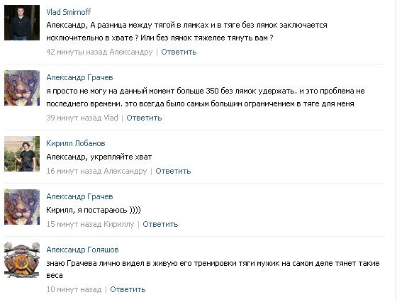 dontsxe Опубликовано 24 мая, 2014 Опубликовано 24 мая, 2014 Показать я чего-то всегда думал, что разнохват почти то же, что и лямки, а оказывается лямки некоторым все таки +100 к тяге дают)) вот кстати ссыль про Грачева и его тяга И полуприсед 575 ))) ппц новый рекорд в 1слое.....................................https://www.youtube.com/watch?v=_fslmDrbxeM#t=67 ппц=( жесть, С каждым годом монстры все больше поражают, что будет через лет 10?