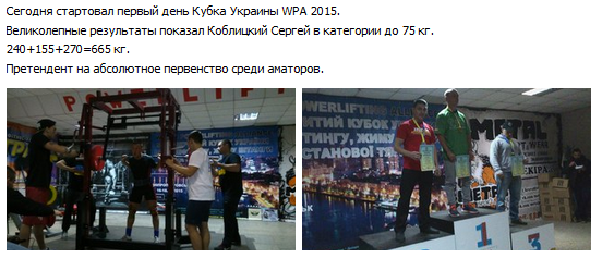 Garon Опубликовано 17 октября, 2015 Опубликовано 17 октября, 2015 онлайн-результаты (протоколами).Ссылка будет работать 16-18 октября ежедневно с 9:00 http://wpau.powerliftingservice.com/online Расписание http://wpa-ukraine.com/records/UkrCup2015/..._ukrcup2015.htm Предварительные результаты первого дня соревнований - Аматоры пауерлифтинг. amateur_lift.xlsx