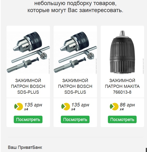 Vladik Опубліковано: 20 липня 2016 Опубліковано: 20 липня 2016 Вчера искал в нете зажимной патрон патрон для сверла. Сегодня в почте письмо от приватбанка и там: Показать Они что отслеживают меня?