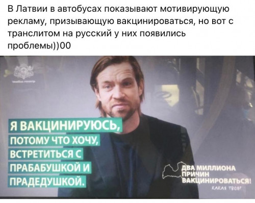 andreyyy Опубликовано 22 апреля, 2021 Опубликовано 22 апреля, 2021 В Латвии идет социальная кампания «Два миллиона причин вакцинироваться!». Участники делятся личными историями, побудившими их пройти вакцинацию от коронавируса. По всей Латвии можно увидеть рекламу с надписями на нескольких языках, в том числе на русском и латышском. Вот только в рекламу с историей бывшего футболиста сборной Латвии и бывшего же президента Латвийской футбольной федерации (ЛФФ) Каспара Горкша закралась ошибка. На латышском его слова звучат как «Я вакцинируюсь, потому что хочу поехать в гости к бабушке и дедушке». Однако в русском варианте цитата Горкша приобрела двусмысленность и превратилась в антирекламу вакцинации: «Я вакцинируюсь, потому что хочу встретиться с прабабушкой и прадедушкой».