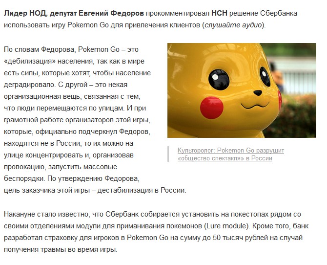 fantom77 Опубликовано 18 июля, 2016 Опубликовано 18 июля, 2016 Дмитрий Рус 17 ч · Хотите расскажу вам интересное об игре "Pokemon Go"? Трижды давал на эту тему интервью, так что пришлось покопаться в англоязычных первоисточниках. - Разработчик игры: Niantic Labs. Внутренний старт-ап Гугла. Связи Гугла с Большим Братом - гуглите (лол!) сами, я пойду чуть глубже. - Ниантик основан Джоном Хэнком (John Hanke), так же основавшим Keyhole, Inc ( "Замочная скважина" ) - проект для картографирования поверхности, выкупленный все тем же Гуглом и создавшим на его базе Гугл-карты, Гугл-Земля, Гугл-Стритс. - А теперь внимание, следите за руками! Keyhole, Inc спонсировался венчурным фондом In-Q-Tel. Это фонд ЦРУ, вполне официально созданный в 1999 году. Посредством вышеуказанных аппликаций, были решены важные задачи: - Обновляемое картографирование поверхности планеты, включая дороги, базы и тд. А ведь когда-то, карты-километровки считались стратегическими и секретными. В гражданские карты даже специально вносились погрешности. - Автомобили-роботы от Гугл-Стритс заглянули во все переулки, картографировав наши города, машины, лица... Оставалась одна проблема. Как заглянуть в наши дома, подвалы, тенистые аллеи, казармы, госучереждения и так далее, по списку? И что бы вы думали? Все та же конторка, Niantic Labs, выпускает гениальную вирусную игрушку, новомодной технологии дополнительной реальности. Стоит вам скачать приложение, и дать ей соответствущие права (доступ к камере, микрофону, гироскопу, GPS, подключаемым устройствам, в том числе - носителям USB и тд), и ваш телефон тут же завибрирует, сообщая о нахождении первых трех покемонов! (Первая тройка всегда появляется сразу и поблизости). Игра потребует заснять их со всех сторон, счастливо наградив вас первым успехом. А заодно получив фото помещения где вы находитесь, включая координаты и угол наклона телефона. Поздравляю вас! Вы только что провели съемку вашей квартиры! Дальше объяснять? Кстати, устанавливая игру, вы принимаете условия оферты. А она - не простая. Niantic вас официально предупреждает: "Мы сотрудничаем с государственными структурами и частными компаниями. Мы можем раскрыть перед ними любую информацию о вас или вашем ребенке...". Но кто же это читает? А еще там есть пункт 6: "наша программа не имеет возможности выполнять запрос вашего браузера "Do not track" -"Не следи за мной". Другими словами - следили и будут следить. Итак, помимо добровольного и радостного картографирования всего и вся, открываются еще забавные возможности. Например, захочется сами_знаете_кому узнать - что сейчас делается в здании, скажем, ГосДумы? И у десятков депутатов, уборщиц, журналистов - завибрируют телефоны: "Пикачу рядом!!!". И счастливые граждане извлекут свои смартфоны, активируя камеры, микрофоны, GPS, гироскопы... И закрутятся на месте, глядя в экран и нагружая каналы связи терабайтами видеопотка... Бинго! Мир снова изменился, мир стал другим. Добро пожаловать в новую эру.