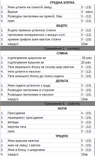 vlad_leo Опубликовано 5 июля, 2011 Опубликовано 5 июля, 2011 первый день я бы оставил одно, ну макс два упр на бицак, грудь гуд второй день подтягивания и тяга блока можно чередовать, а не делать в один день вместо тяги блока к поясу поставил последним упр. становую, хотя если есть мертвая тяга, то можно не менять третий день ноги гуд, тока не понял что такое "перехресни" приседания на трицепс тоже бы оставил макс два упр. фронтальные спс за советы, учту.. биц триц буду делать по два упражнения, просто буду чередовать их, раз одни, в другой раз вторые... становую снял... только закончил силовой цыкл... дам пояснице передохнуть.